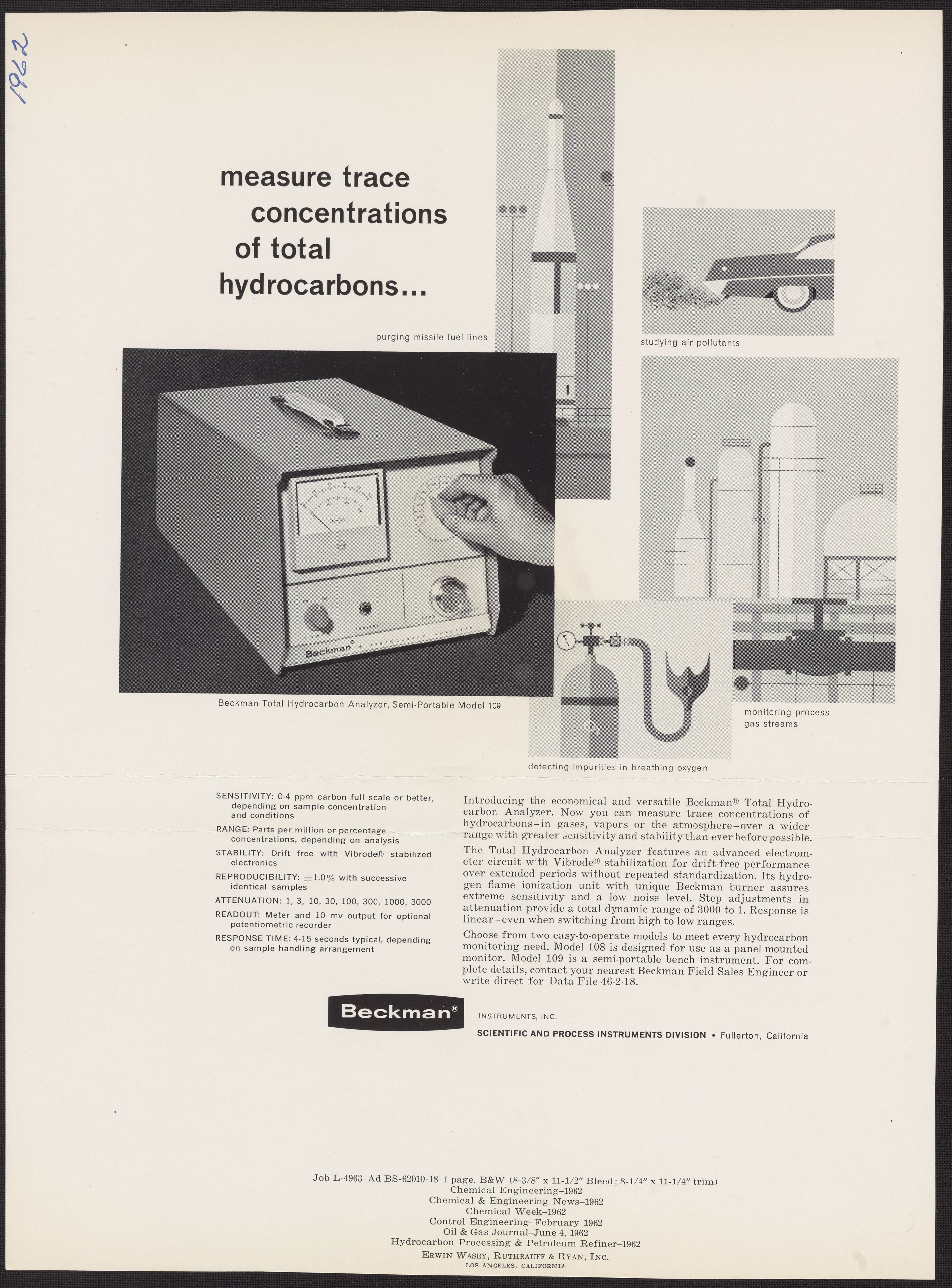 Erwin Wasey, Ruthrauff, and Inc. Beckman Instruments. “Measure Trace Concentrations of Total Hydrocarbons...,” 1962. Beckman Historical Collection, Box 49, Folder 20. Science History Institute. Philadelphia. https://digital.sciencehistory.org/works/4m90dv50r.