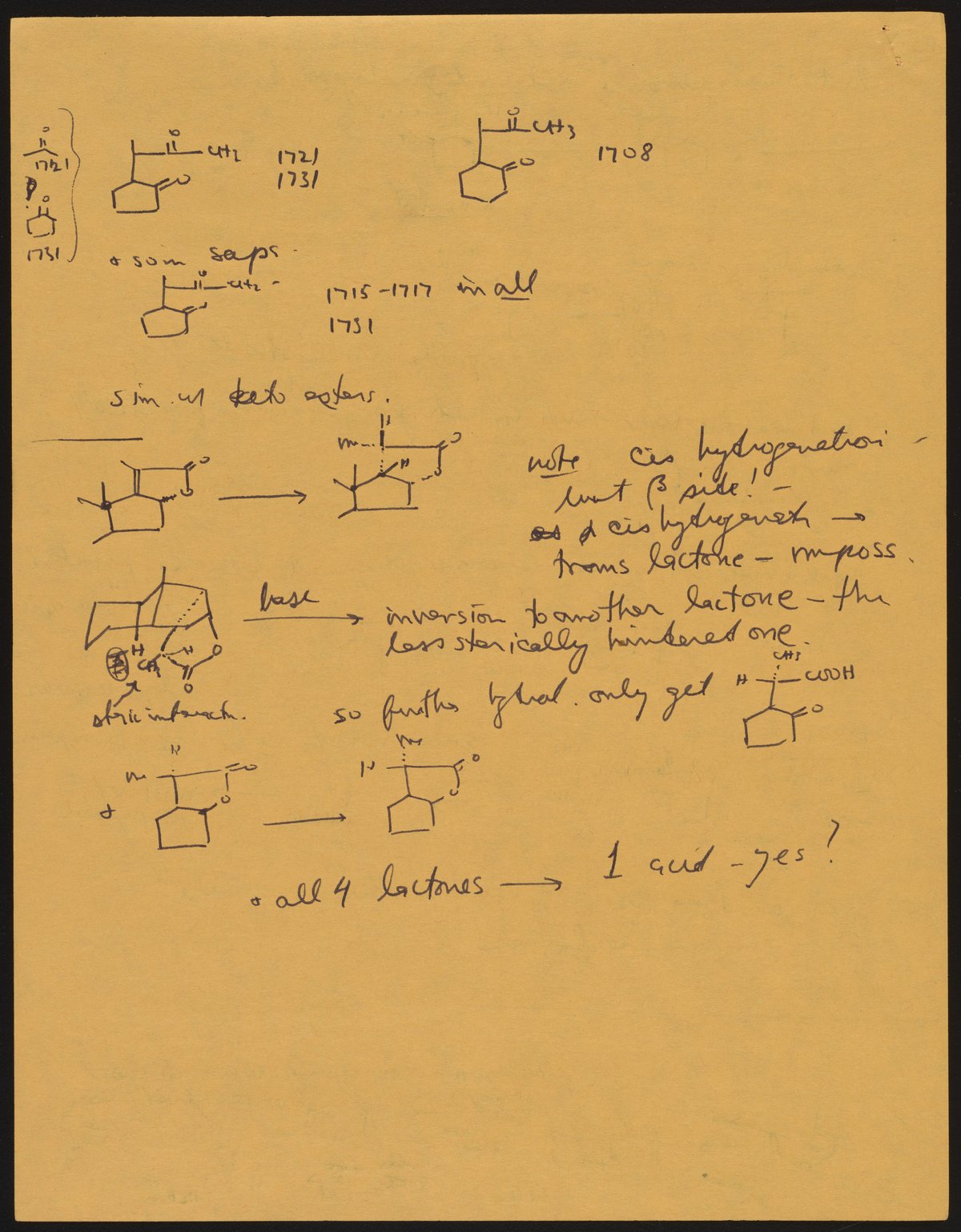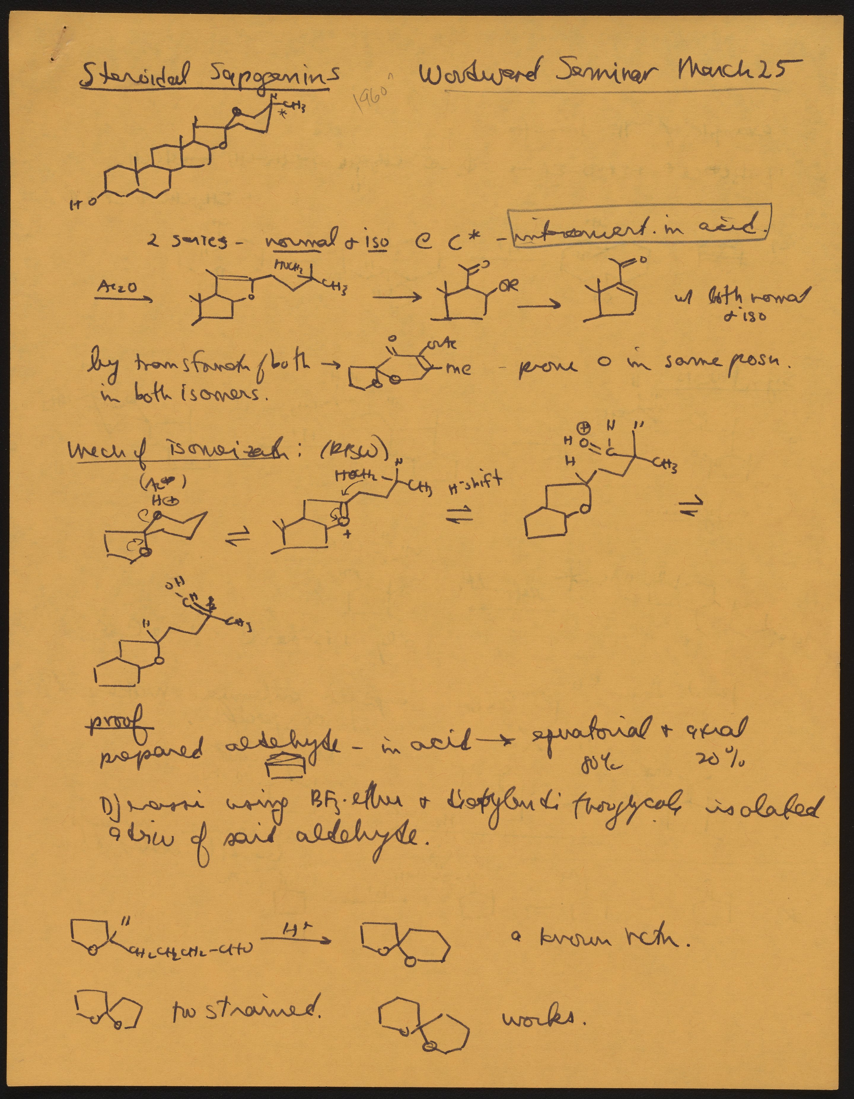 Kohler, Robert E. “R. B. (Robert Burns) Woodward Seminar Entitled ‘Steroidal Sapogenins.’” Notes from R. B. (Robert Burns) Woodward's Seminars, circa 1959–1966. Folder 2. Science History Institute. Philadelphia. https://digital.sciencehistory.org/works/4m90dw517.