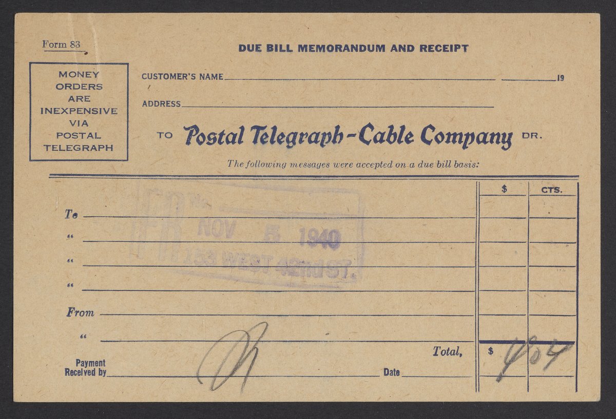 Bredig, Max Albert. “Money Order Form for the Postal Telegraph-Cable Company,” November 5, 1940. Papers of Georg and Max Bredig, Box 7, Folder 24. Science History Institute. Philadelphia. https://digital.sciencehistory.org/works/4mi2o4w.