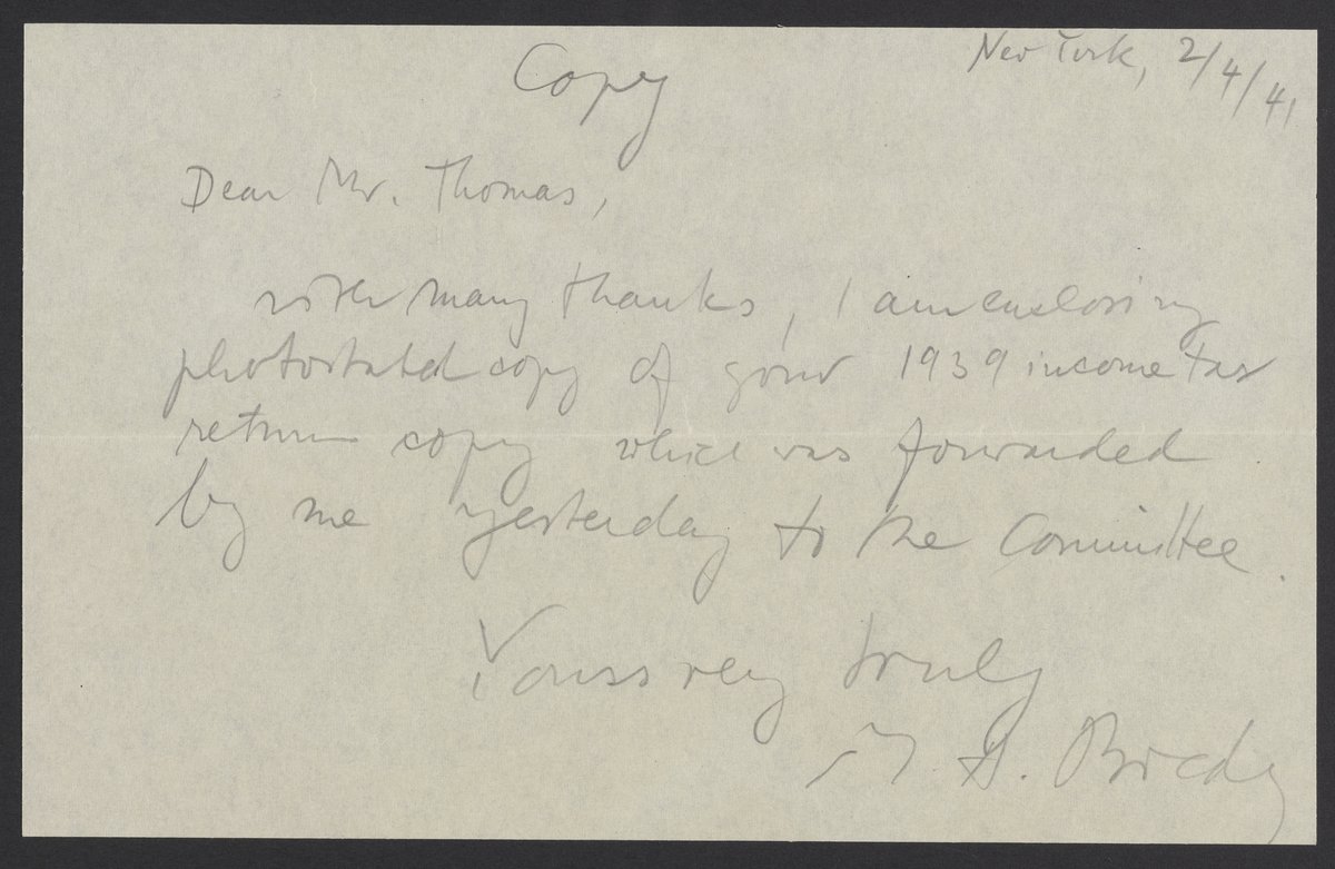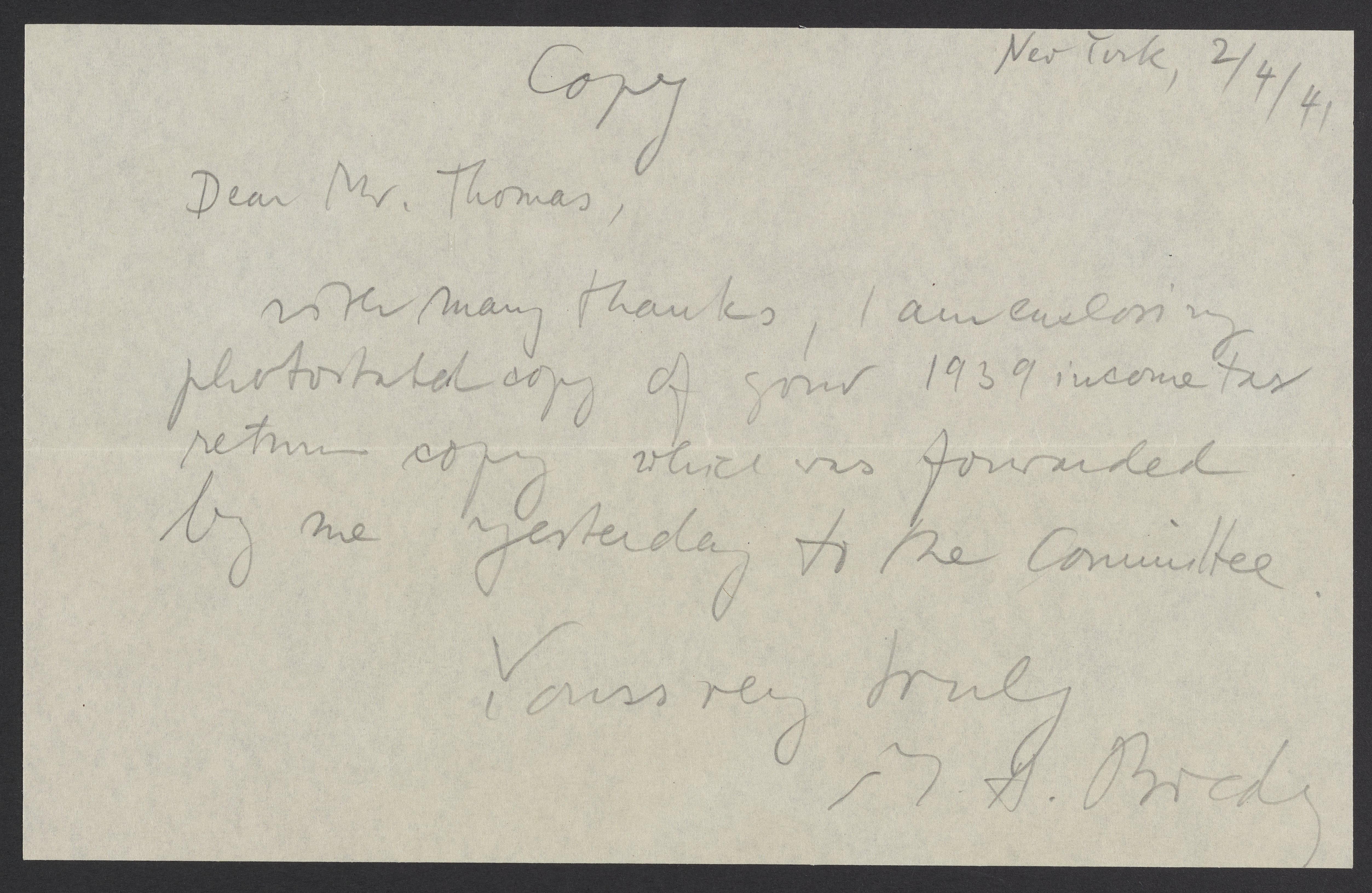 Letter marked "copy" from Max Bredig (1902-1977) to Abel Cary Thomas. The letter thanks Thomas for sending him copies of his 1939, income tax returns.