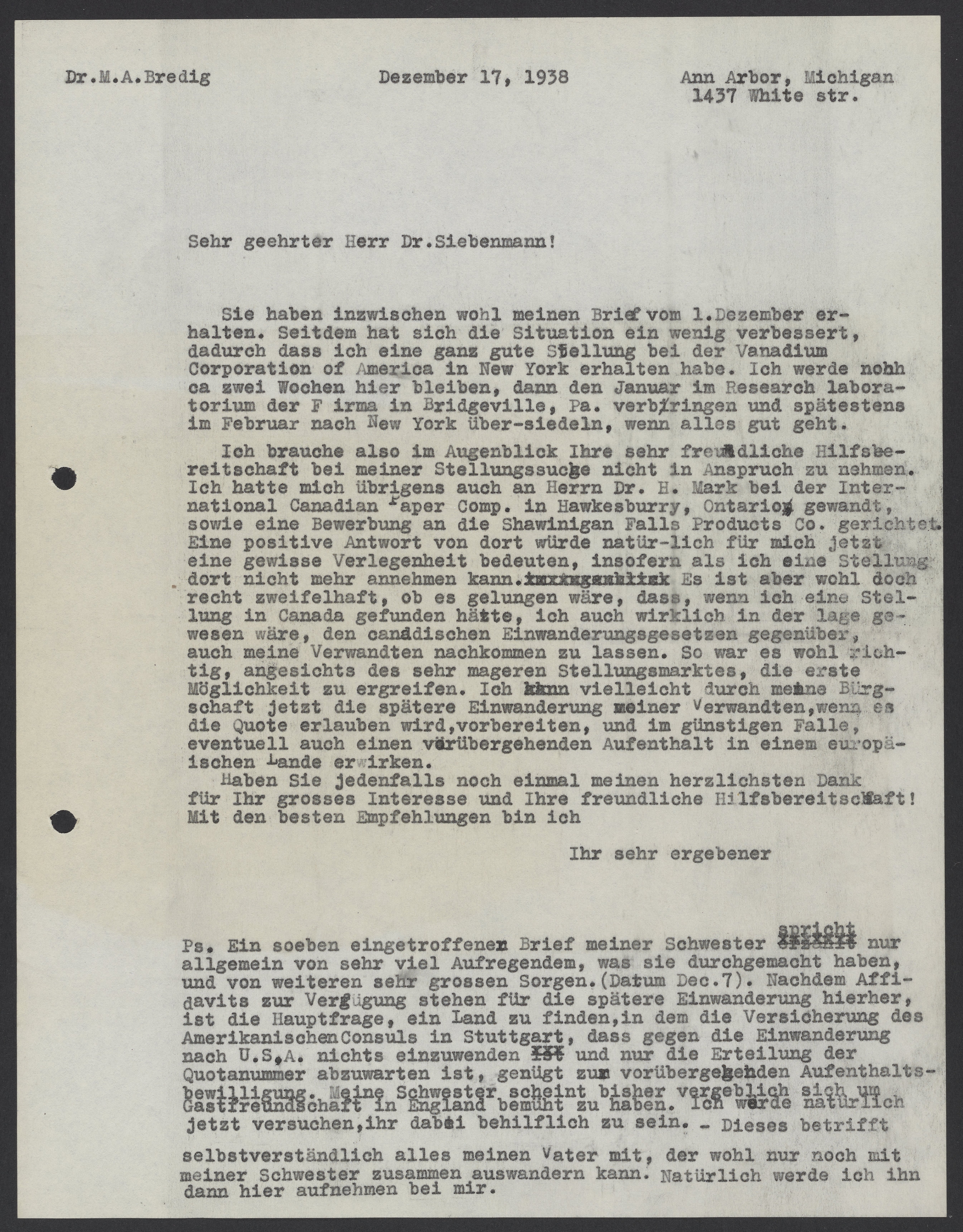 Sie haben inzwischen wohl meinen Brief vom 1. Dezember erhalten. Seitdem hat sich die Situation ein wenig verbessert, dadurch dass ich eine ganz gute Stellung bei der Vanadium Corporation of America in New York erhalten habe. Ich werde noch ca zwei Wochen hier bleiben, dann den Januar im Research laboratorium der Firma in Bridgeville, Pa. verbringen und spätestens im Februar nach New York übersiedeln, wenn alles gut geht.