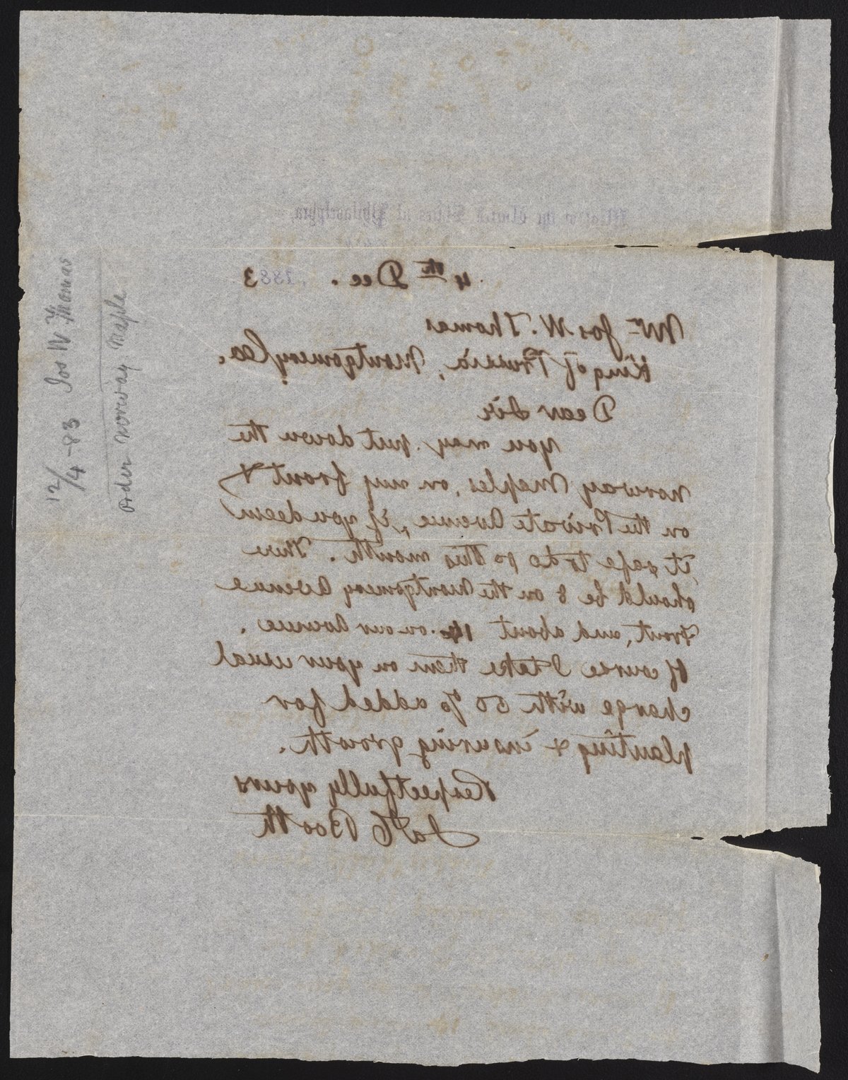 Thomas, Joseph W. “Letter from James Curtis Booth to J.W. Thomas, December 4, 1883,” December 4, 1883. Papers of James Curtis Booth, Box 2, Folder 10. Science History Institute. Philadelphia. https://digital.sciencehistory.org/works/4n2aq0n.