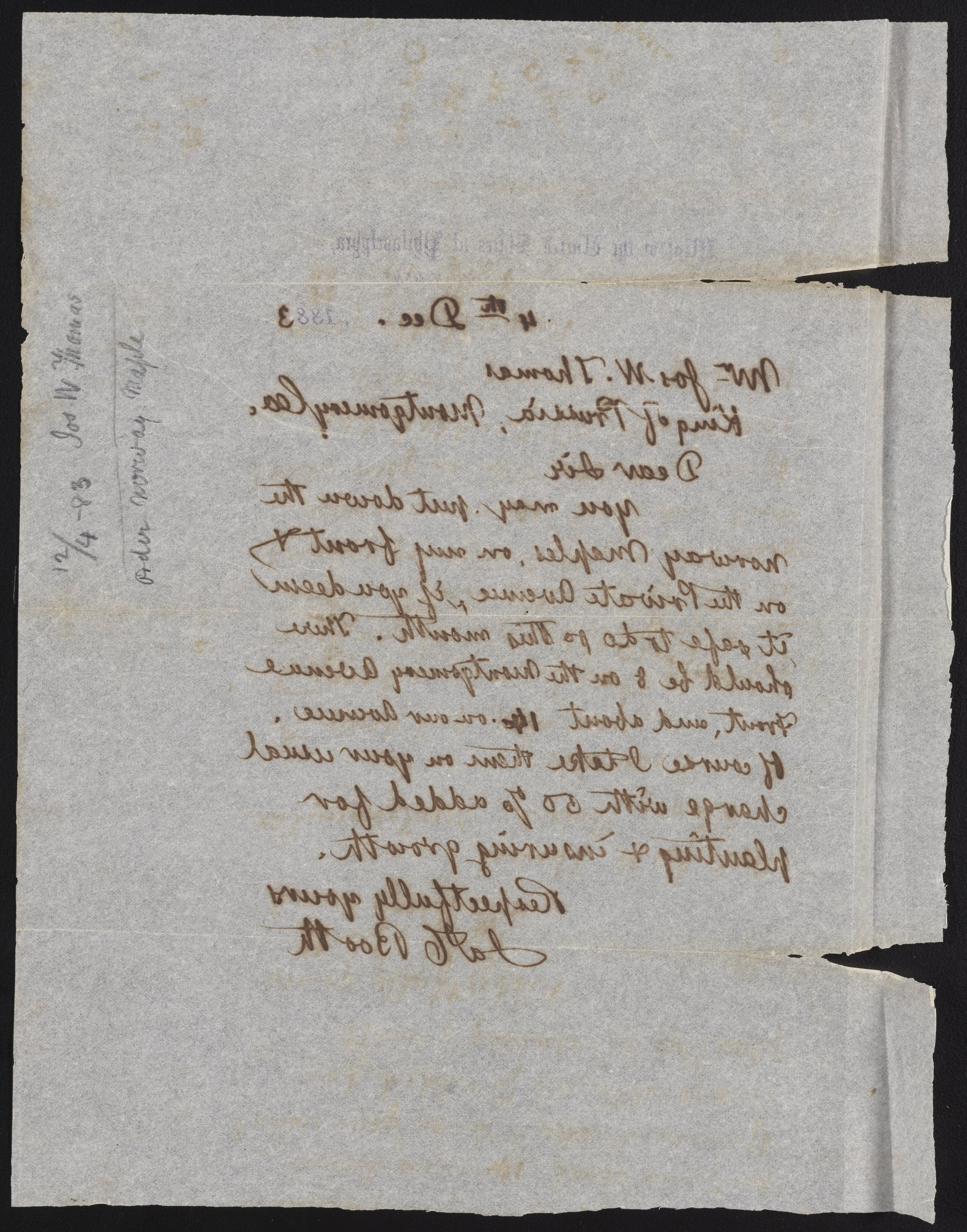 Small JPG1200 x 1529px — 391 KBLarge JPG2880 x 3670px — 2.2 MBFull-sized JPG5081 x 6475px — 5.8 MBOriginal fileTIFF — 5081 x 6475px — 94.2 MBJames Curtis Booth (1810-1888) gives permission to Joseph W. Thomas to plant his Norway Maple trees if Thomas believes it to be appropriate this month.