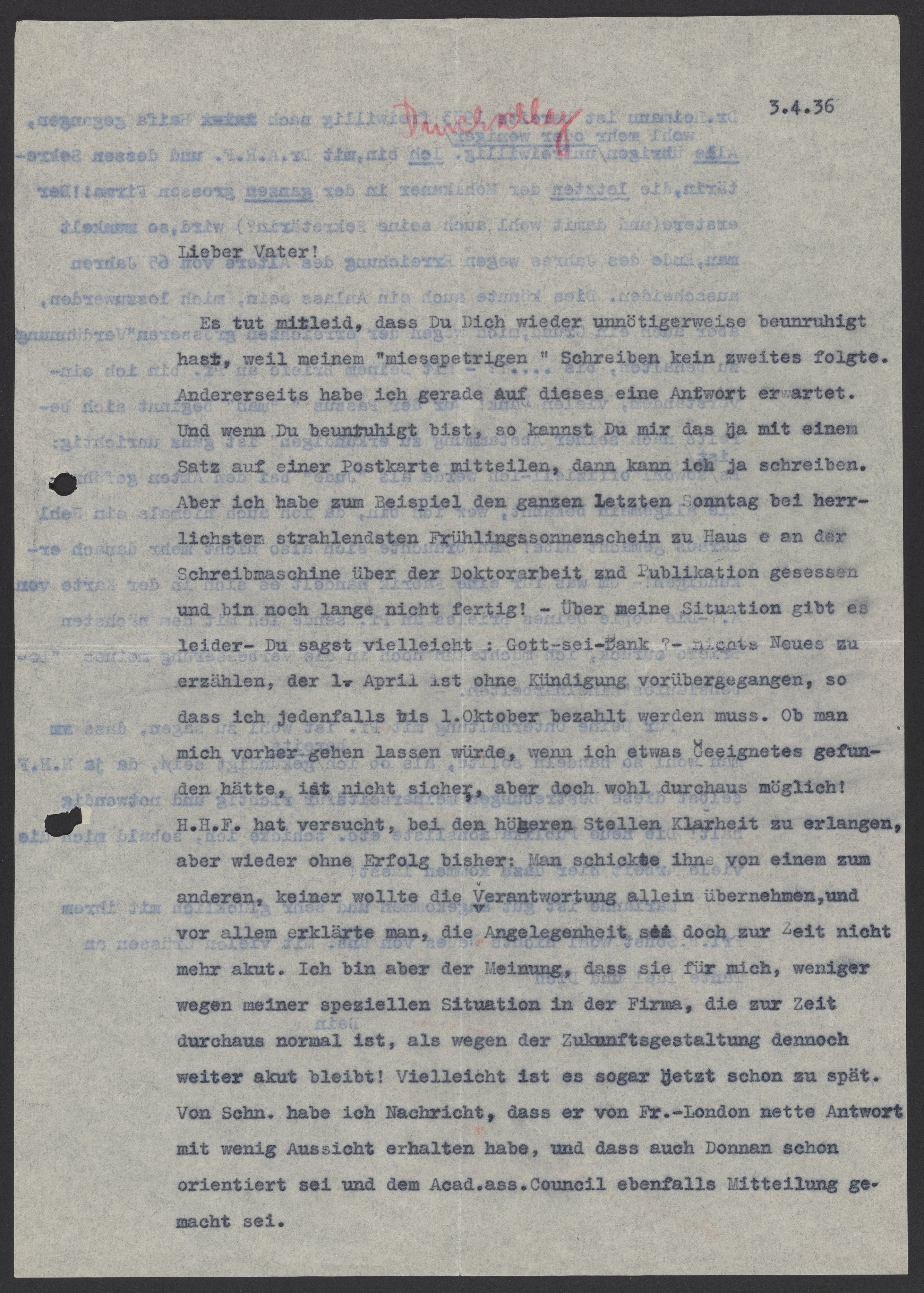 Es tut mir leid, dass Du Dich wieder unnötigerweise beunruhigt hast, weil meinen „miesepetrigen“ Schreiben kein zweites folgte. Andererseits habe ich gerade auf dieses eine Antwort erwartet. Und wenn Du beunruhigt bist, so kannst Du mir das ja mit einem Satz auf einer Postkarte mitteilen, Aber ich habe zum Beispiel den ganzen letzten Sonntag bei Herr Frühlingssonnenschein zu Hause an der Schreibmaschine über der Doktorarbeit und Publikation gesessen und bin noch lange nicht fertig! Über meine Situation gibt es – Gott sei Dank – nichts Neues zu erzählen, der 1. April ist ohne Kündigung vorübergegangen, so dass ich jedenfalls bis 1. Oktober bezahlt werden muss. Ob man mich vorher gehen lassen würde, wenn ich etwas Geeignetes gefunden hätte, ist nicht sicher aber doch wohl durchaus möglich!