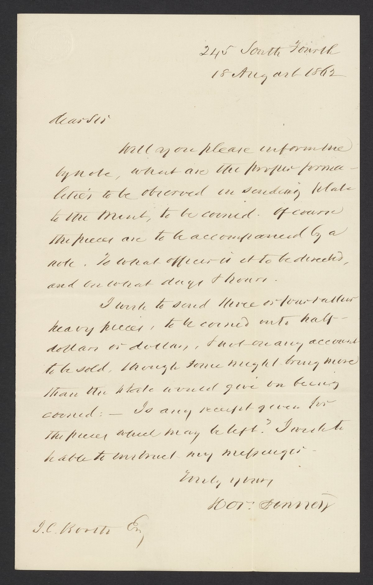 Small JPG1200 x 1882px — 255 KBFull-sized JPG2238 x 3510px — 791 KBOriginal fileTIFF — 2238 x 3510px — 22.5 MBHorace Binney (1780-1875), member of the United States House of Representatives, writes to James Curtis Booth (1810-1888) with a desire to send some plate to the Mint to be melted down into coins.