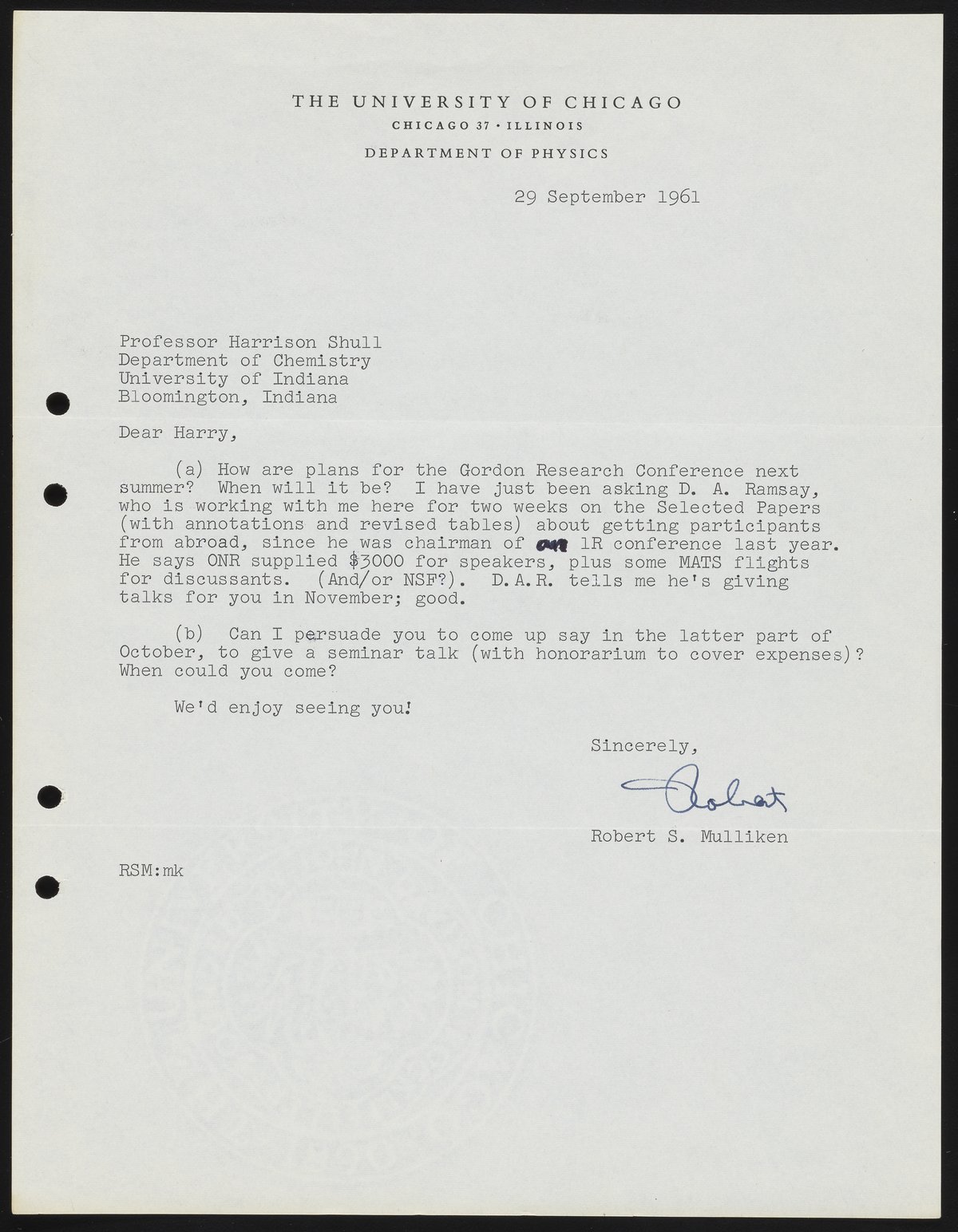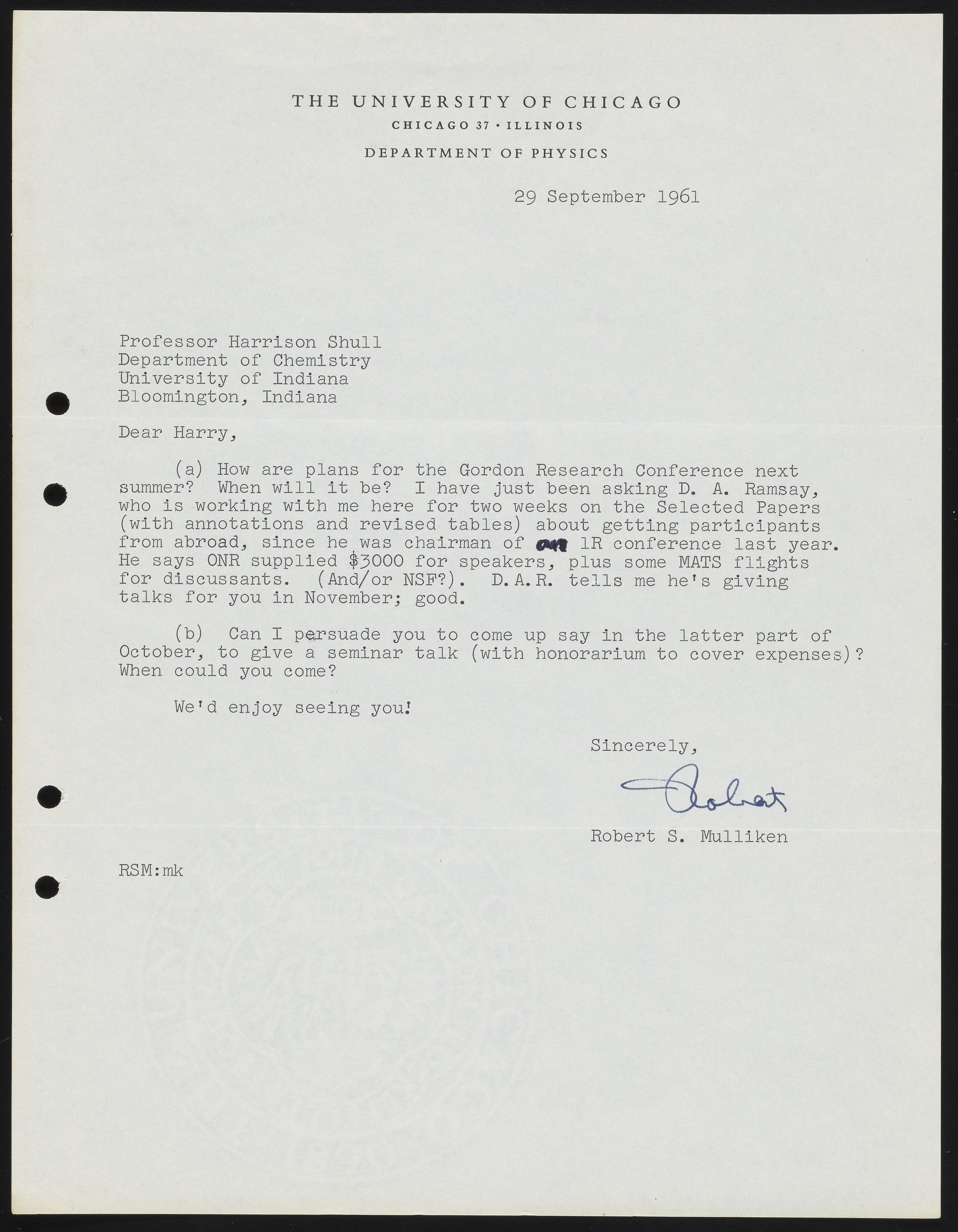 Letter between Robert S. Mulliken and Harrison Shull, American quantum chemists, concerning upcoming Gordon Research Conference and proposal for Shull to give a seminar talk at the University of Chicago.