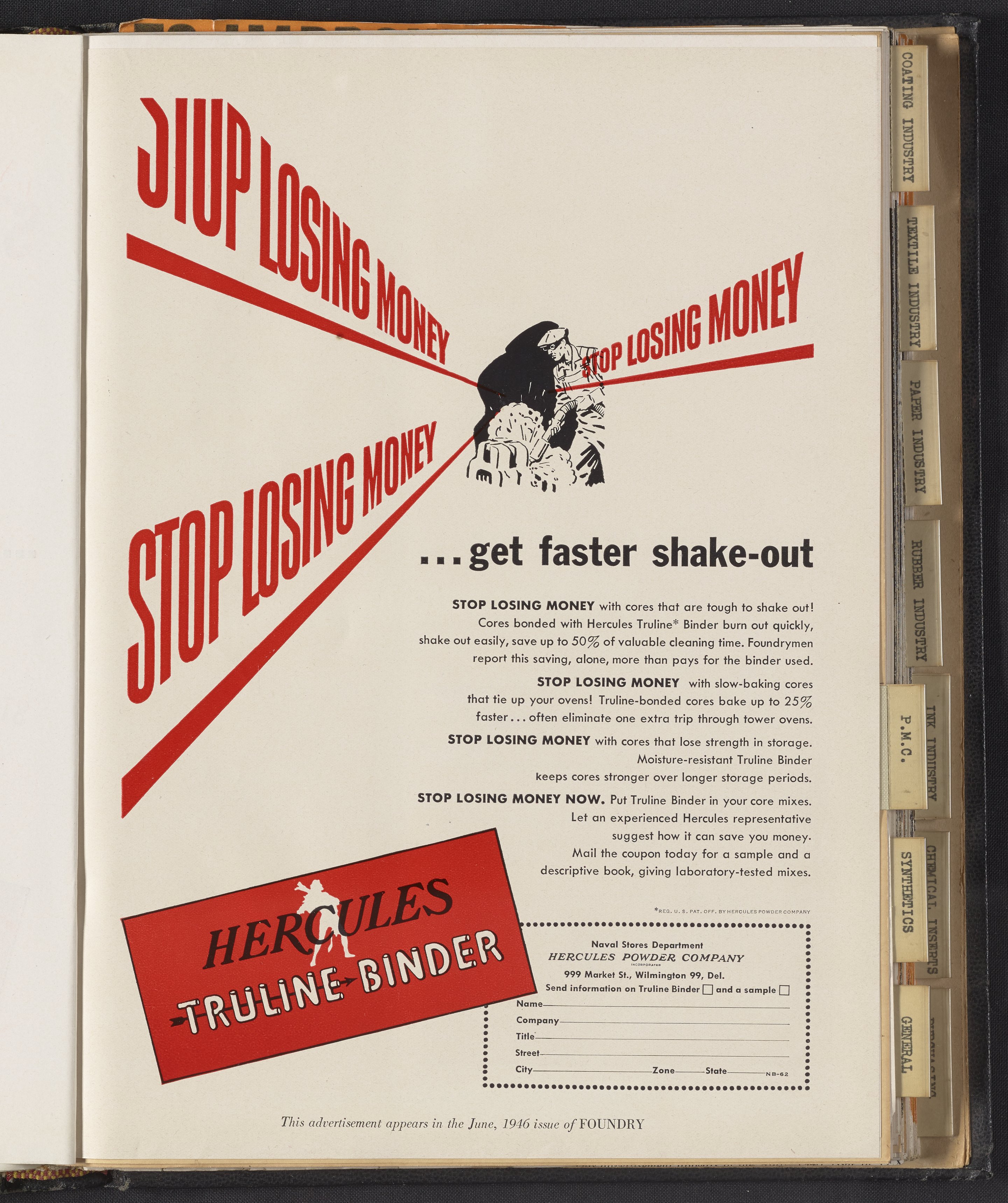 Hercules Incorporated. “Stop Losing Money...Get Faster Shake-Out.” 1946 Hercules Advertisements, 1946. Records of Hercules Incorporated, Volume 1946. Science History Institute. Philadelphia. https://digital.sciencehistory.org/works/4q77fs01j.