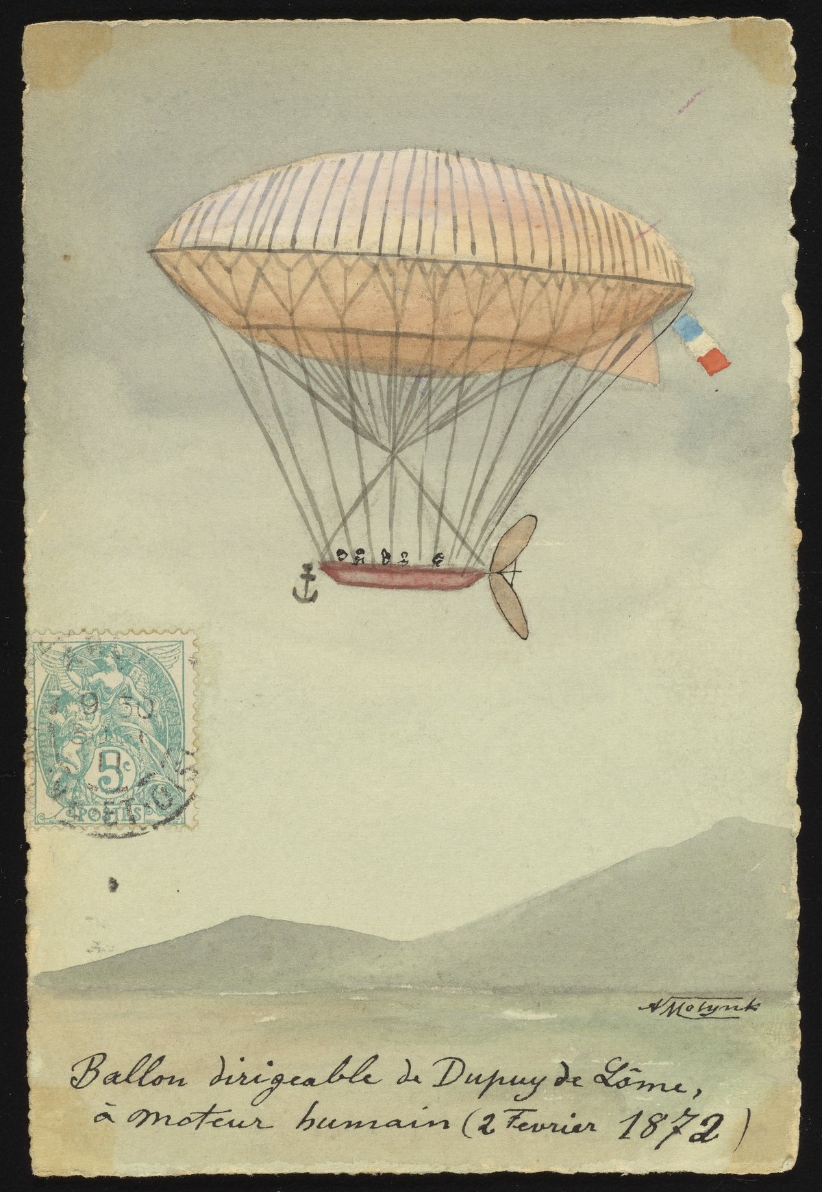 Molynk, A. “Ballon Dirigeable De Dupuy De Lôme, à Moteur Humain.” Watercolor (paint), 1872–1909. Donald F. Othmer Papers, Box 287. Science History Institute. Philadelphia. https://digital.sciencehistory.org/works/4q77fs41h.