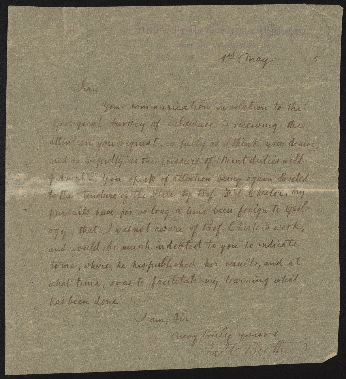 Booth, James Curtis. “Letter from James Curtis Booth to John Wesley Powell,” May 1, 1885. Papers of James Curtis Booth, Box 2, Folder 8. Science History Institute. Philadelphia. https://digital.sciencehistory.org/works/4qe31v7.