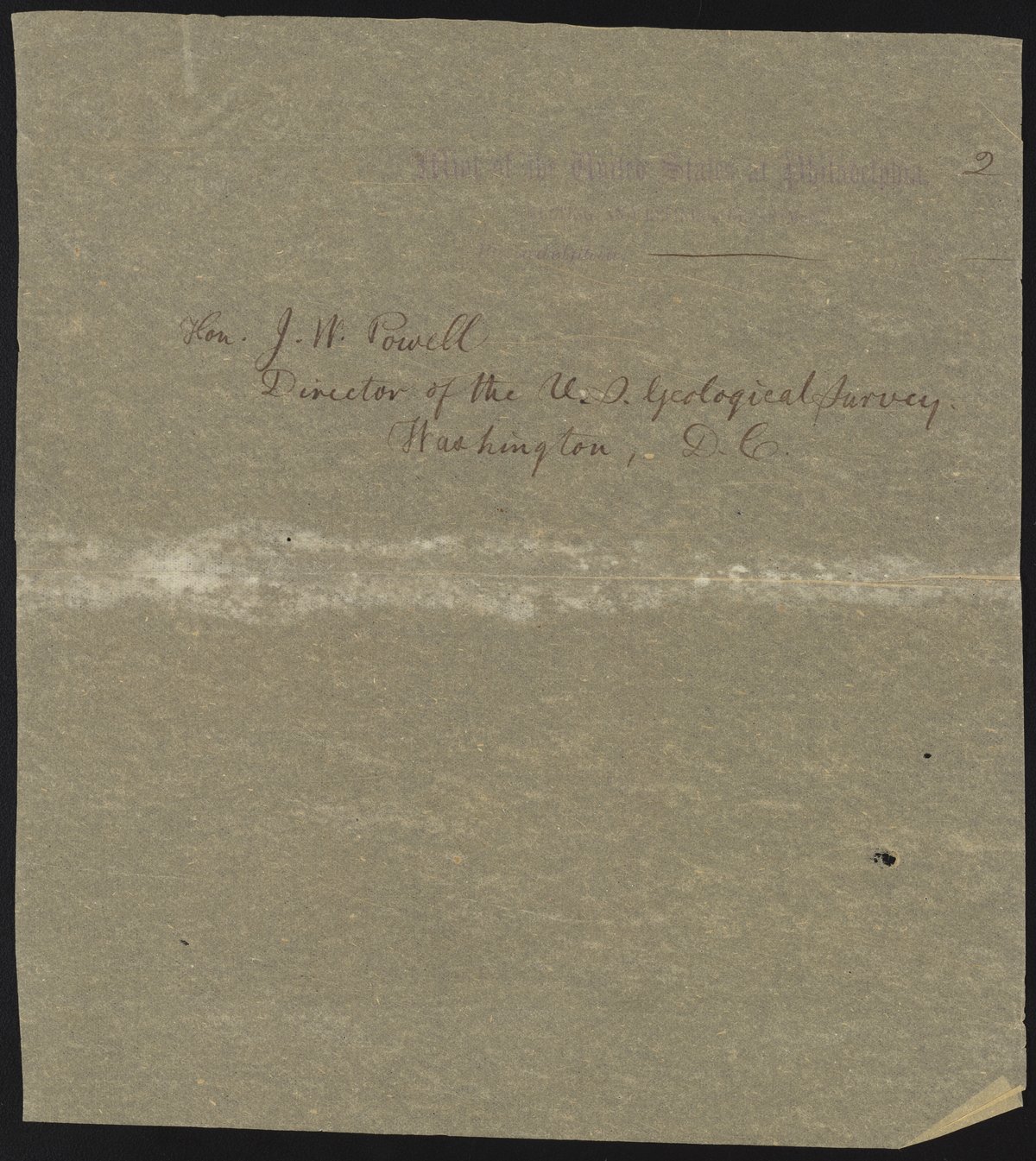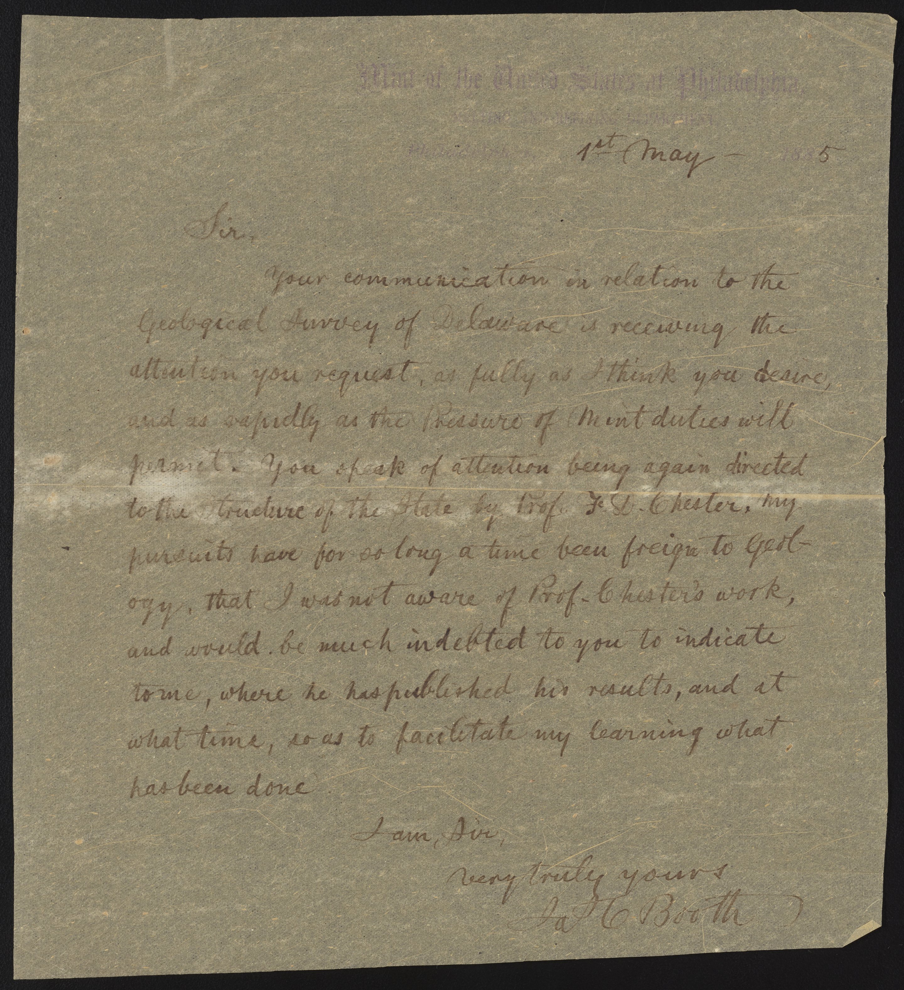 Small JPG1200 x 1314px — 334 KBLarge JPG2880 x 3154px — 2.1 MBFull-sized JPG5540 x 6067px — 7.0 MBOriginal fileTIFF — 5540 x 6067px — 96.2 MBJames Curtis Booth (1810-1888) assures James W. Powell (1834-1902), Director of the United States Geological Survey at Washington D.C., that Booth is working diligently on a Geographical Survey of Delaware.