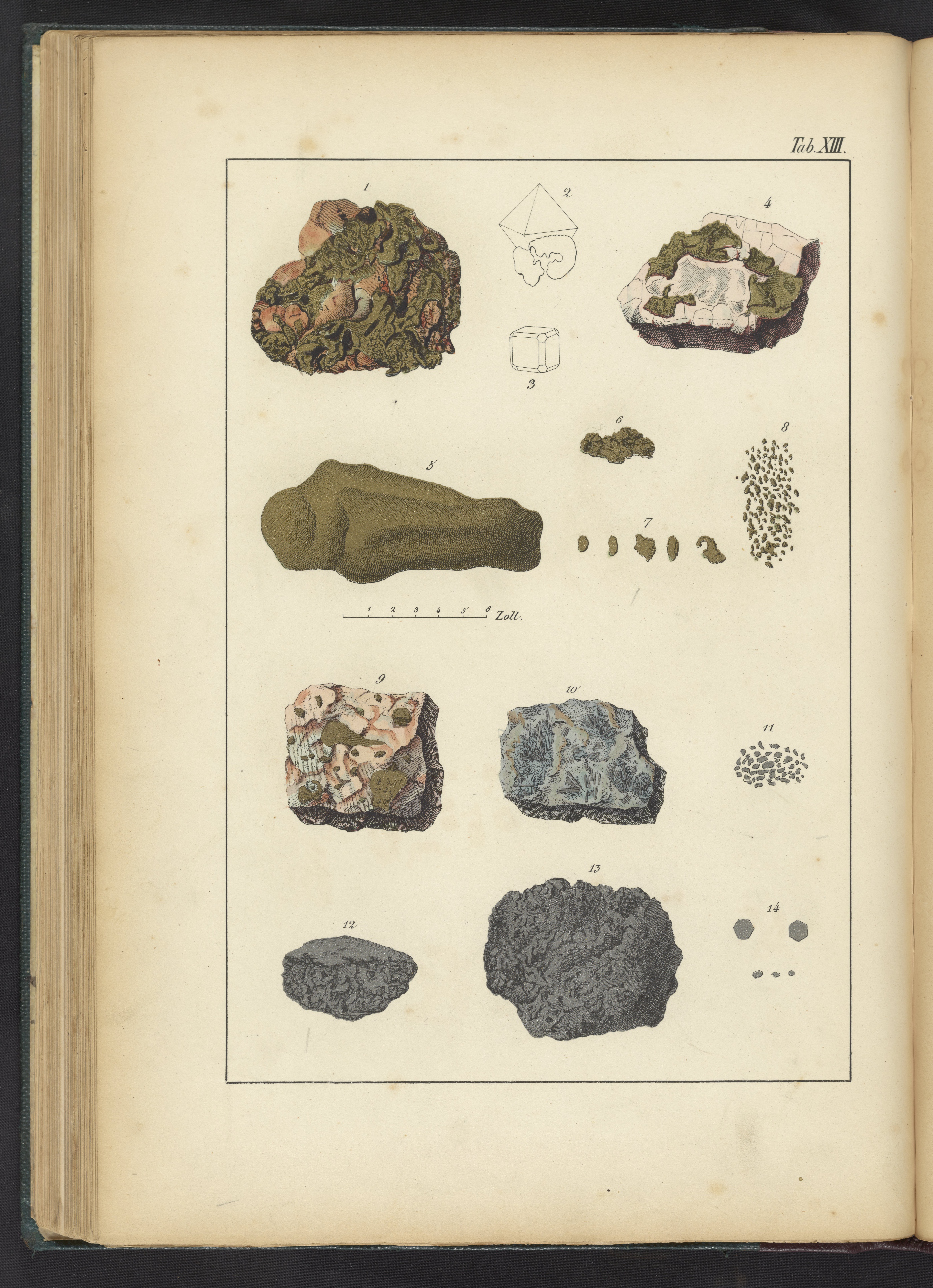 This hand-colored plate is part of the first edition English translation of the German Das Mineralreich in Bildern. The publication consists of two sections; the first is an introduction including topics such as the formation of crystals and chemical reactions of crystals; the second is devoted to the description of various mineral groups including precious stones, hornblende and augitic minerals, felspathic minerals, micaceous minerals, zeolitic minerals, calcareous minerals, and various salts and compounds. The final pages of the book contain twenty-four lithograph plates depicting crystalline structures and mineral forms. The first two plates are labeled A and B and the remaining plates are numbered I through XXII. The plates are hand-colored, using metallic finishes to create a lustrous effect.