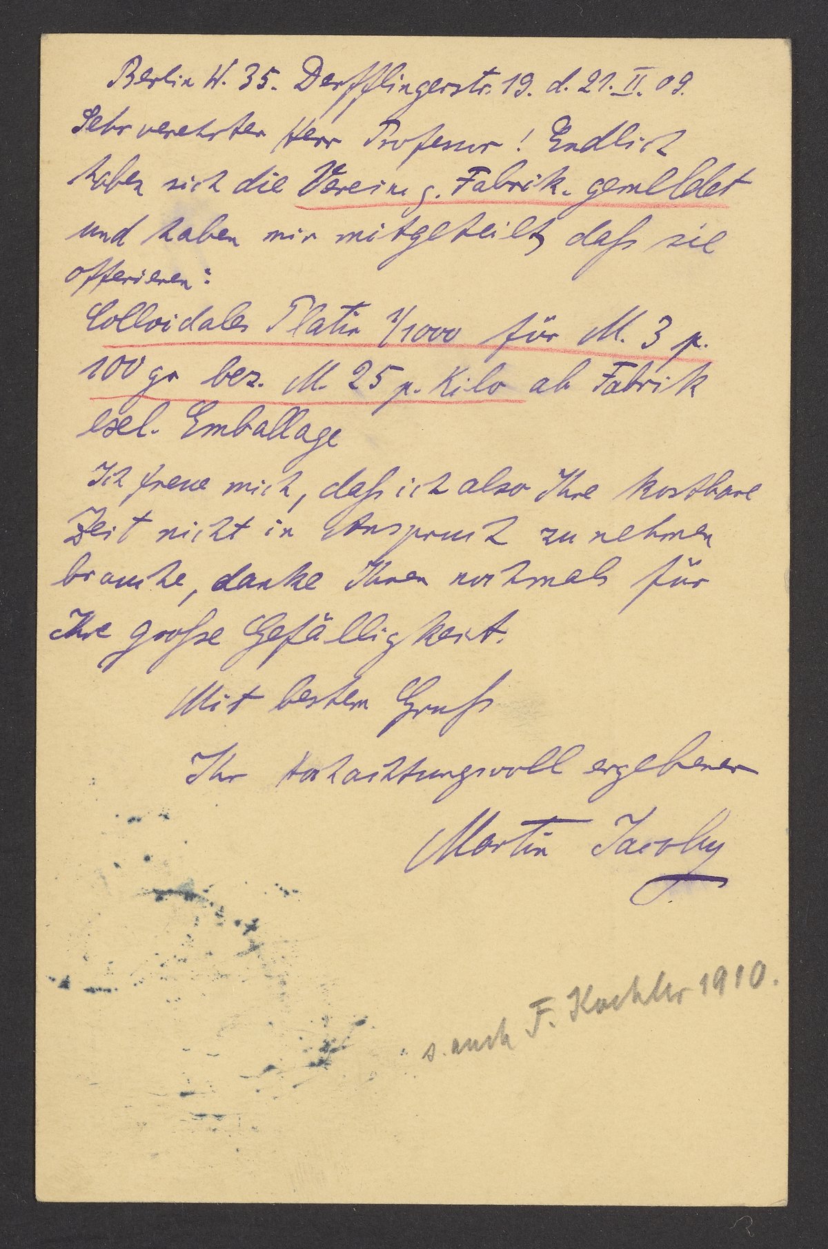Taevby, Martin. “Postcard to Georg Bredig from Martin Taevby,” February 27, 1909. Papers of Georg and Max Bredig, Box 3, Folder 20. Science History Institute. Philadelphia. https://digital.sciencehistory.org/works/4rlrn83.