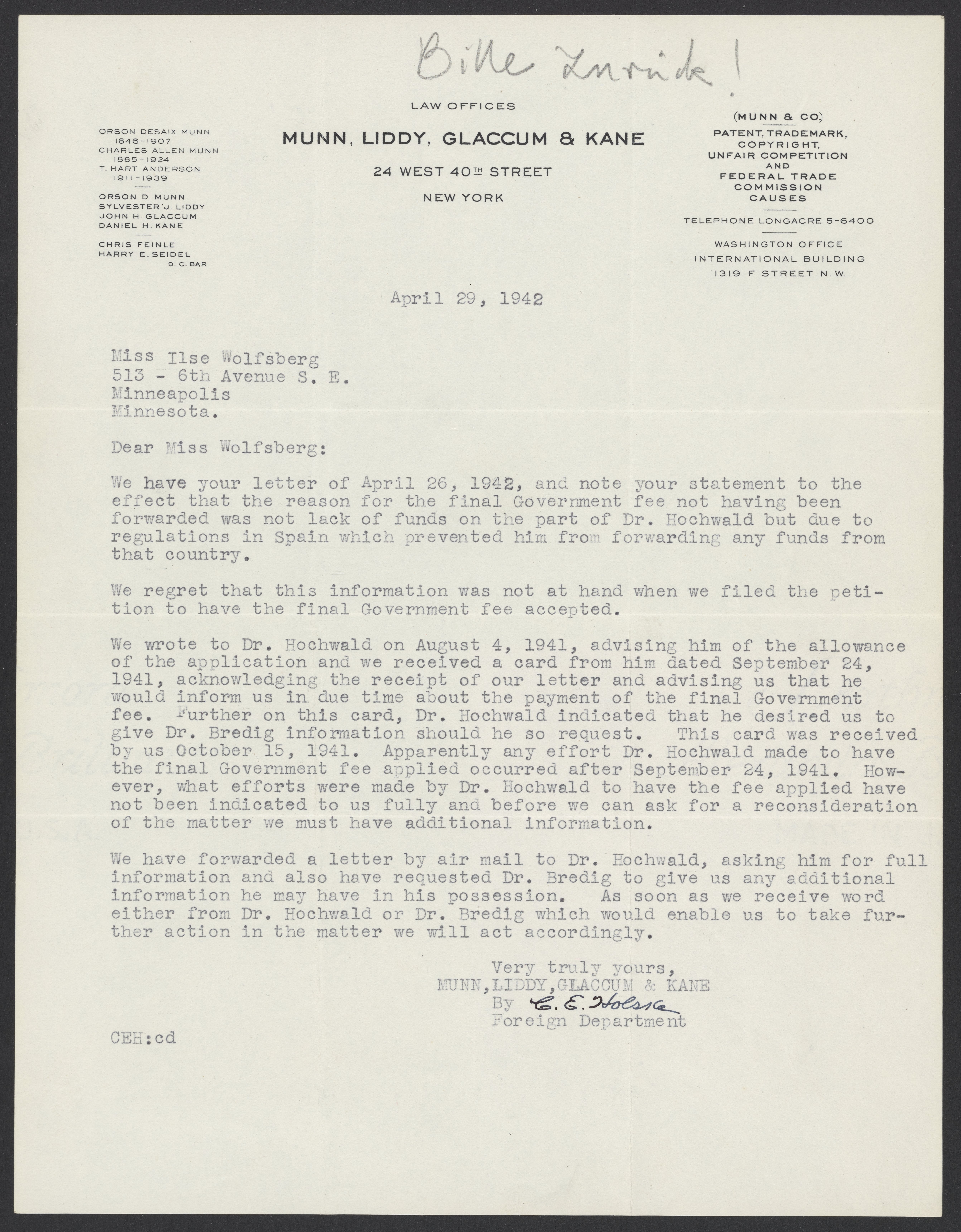 Attorney, Clarence Holske, thanks Ilse Wolfsberg for her clarifying information regarding her fiancé, Fritz Hochwald's (1897-1968) inability to pay a government fee for a patent filing. Holske has contacted Hochwald and Max Bredig (1902-1977) to obtain further information to clear up the matter.