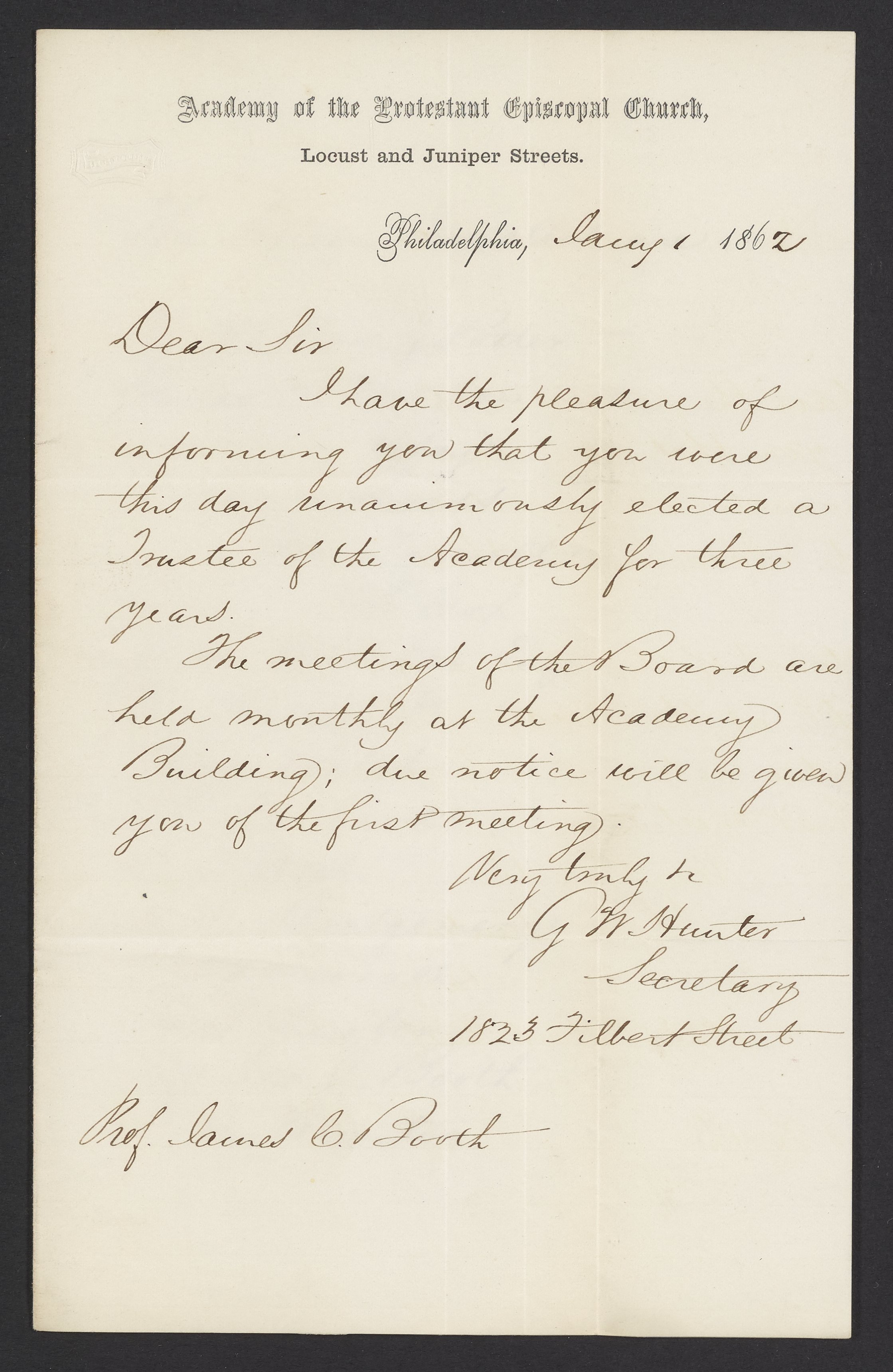 Small JPG1200 x 1843px — 247 KBFull-sized JPG2238 x 3438px — 776 KBOriginal fileTIFF — 2238 x 3438px — 22.1 MBG. W. Hunter, Secretary of the Academy of the Protestant Episcopal Church, informs James Curtis Booth (1810-1888) that he has been unanimously elected a Trustee of the Academy.