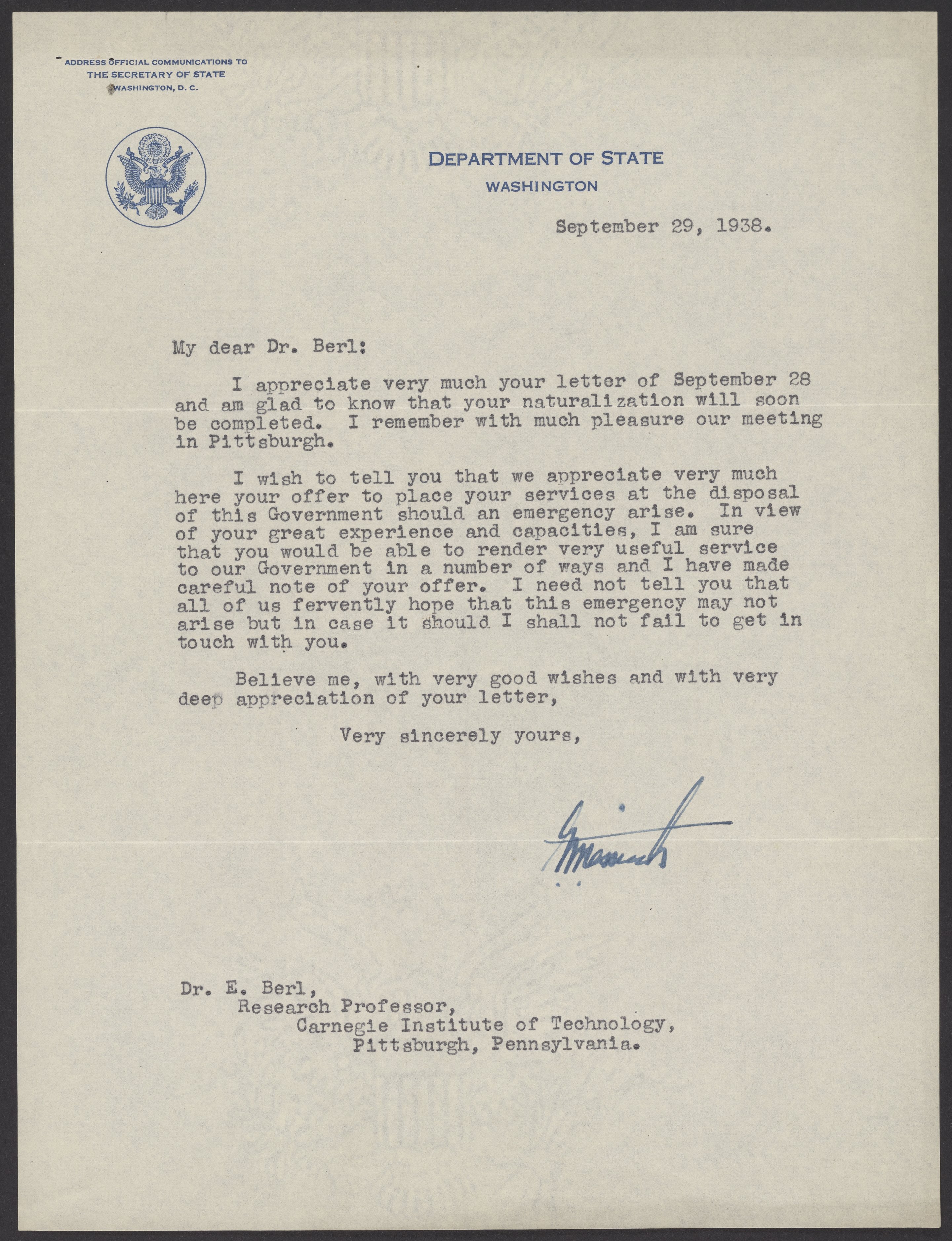 United States. Department of State. “Letter from the United States Department of State to Ernst Berl, September 29, 1938,” September 29, 1938. Ernst Berl Papers, Box 2, Folder 46. Science History Institute. Philadelphia. https://digital.sciencehistory.org/works/4sauvny.