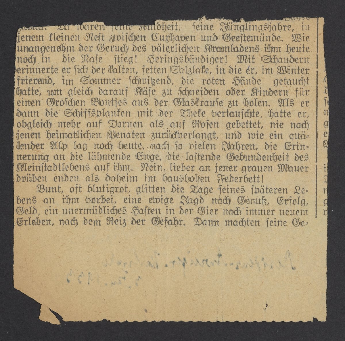 Prof. Einstein ist in Colon (Panama) eingetroffen. Er erklärte bezüglich der Forderung der nationalen Frauenorganisation der Vereinigten Staaten, ihm die Einreiseerlaubnis zu verweigern: „Ich habe noch nie von Seiten des schönen Geschlechts eine so energetische Ablehnung gegen jede Annäherung gefunden. Sollte es doch einmal der Fall gewesen sein, dann sicher von so vielen auf einmal. Aber haben sie nicht Recht, diese wachsamen Bürgerinnen? Weshalb soll man auch einen Menschen einladen, der mit demselben Appetit u. Behagen hartgesottene Kapitalisten frißt, wie einst das Ungeheuer Minotaurus in Kreta ledere griechische Jungfrauen und der zudem so gemein ist, jeden Krieg abzulehnen, ausgenommen den unvermeidlichen mit der eigenen Gattin? Hört also auf eure Augen patriotischen Frauen und denkt daran, daß auch das Capitol des mächtigen Roms einst Geschnatter seiner getreue Gänse gerettet wurde. Albert Einstein.“