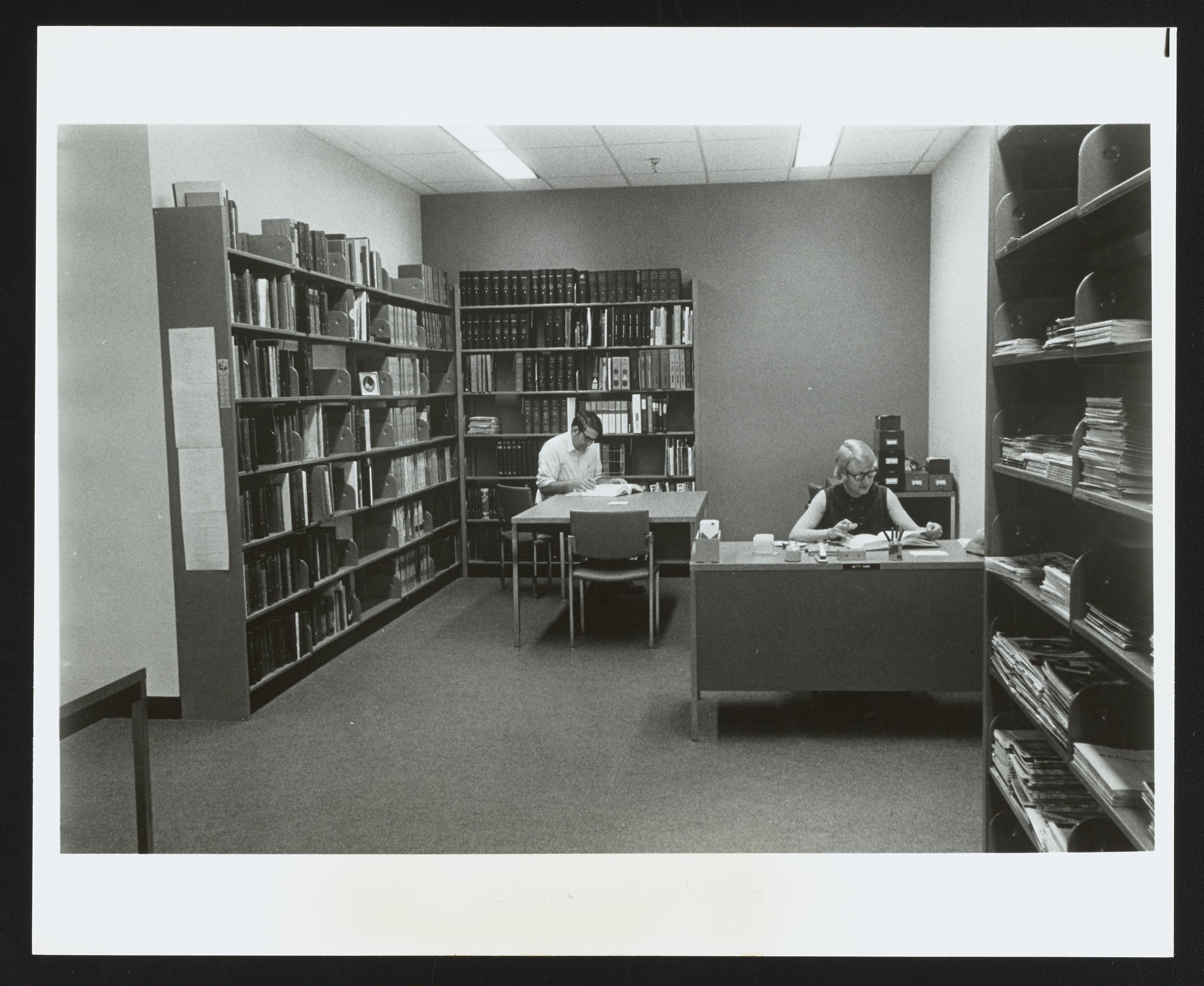 View of the Library and Information Retrieval Quarters at the Crompton & Knowles Research Center in Gibraltar, Pennsylvania. Seated are researcher John King (left) and Elizabeth B. Hamf (Literature Chemist) at right.
