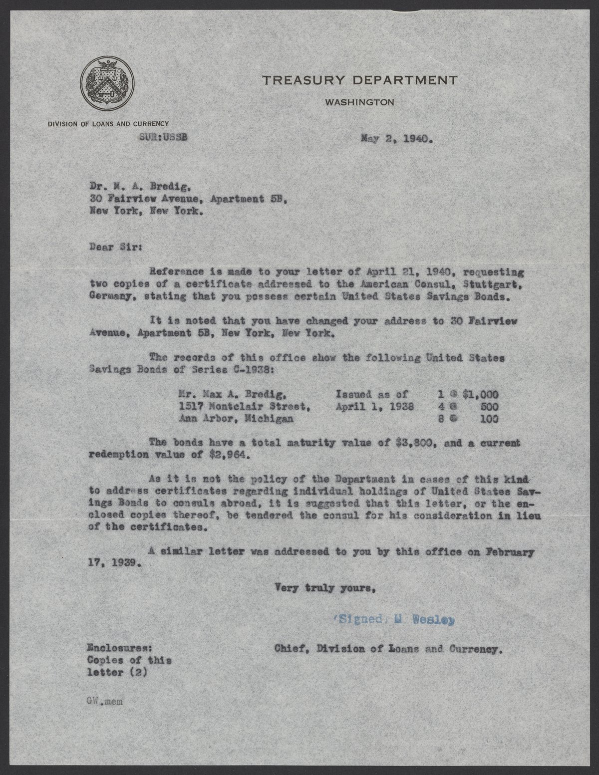 Wesley, W., and United States. Department of the Treasury. “Letter from the Chief of Division of Loans and Currency to Max Bredig,” May 2, 1940. Papers of Georg and Max Bredig, Box 7, Folder 19. Science History Institute. Philadelphia. https://digital.sciencehistory.org/works/4tci6gu.