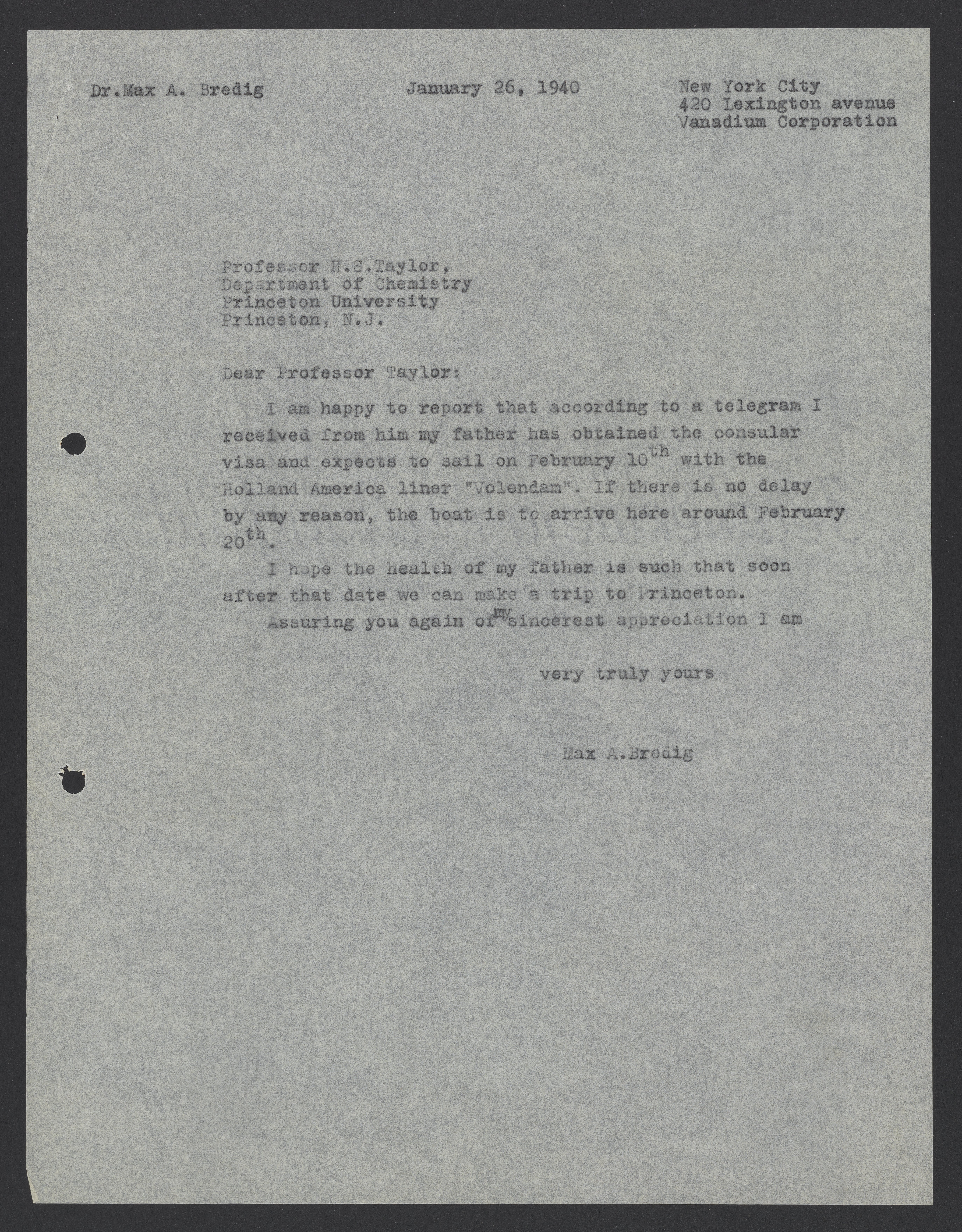 Letter from Max Bredig to Hugh S. Taylor, January 26, 1940