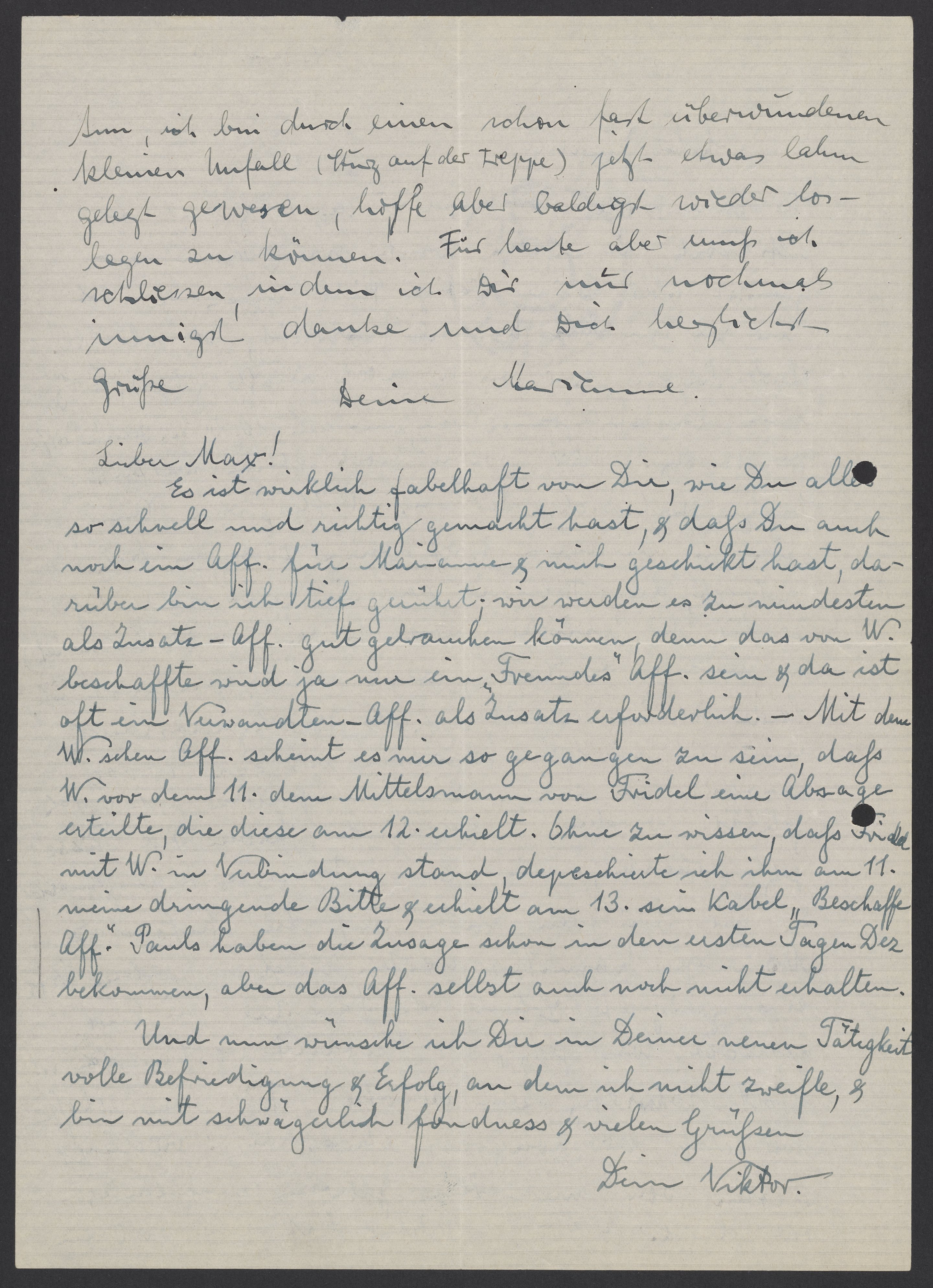 Es ist wirklich fabelhaft von Dir, wie Du alles so schnell und richtig gemacht hast, dass Du auch noch ein Aff. für Marianne und mich geschickt hast, darüber bin ich tief gerührt. Wir werden es zu mindestens als Zusatz – Aff. gut gebrauchen können, denn das von W. beschaffte wird ja nur ein Freundes-Aff. sein & da ist oft ein Verwandten-Aff als Zusatz erforderlich. – Mit dem W. schen Aff. scheint es mir so gegangen zu sein, dass W. vor dem 11. dem Mittelsmann von Fridel eine Absage erteilte, die dieser am 12. erhielt. Ohne zu wissen, dass Fridel mit W. in Verbindung stand, depeschierte ich ihm am 11. meine dringende Bitte, erhielt am 13. sein Kabel „Beschaffe Aff.“ Pauls habe die Zusage schon in den ersten Tagen Dez. bekommen, aber das Aff. selbst auch noch nicht erhalten.