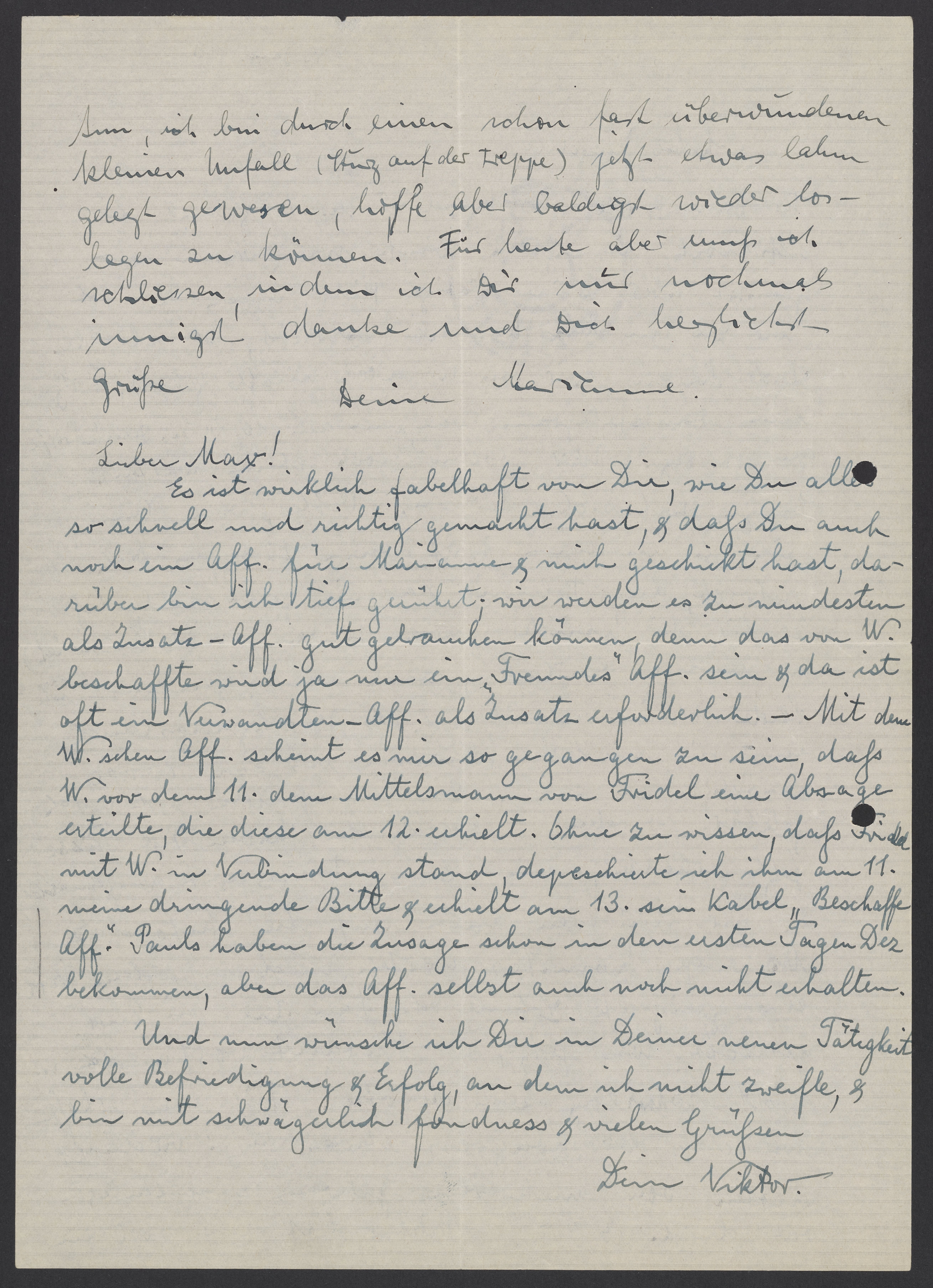 Es ist wirklich fabelhaft von Dir, wie Du alles so schnell und richtig gemacht hast, dass Du auch noch ein Aff. für Marianne und mich geschickt hast, darüber bin ich tief gerührt. Wir werden es zu mindestens als Zusatz – Aff. gut gebrauchen können, denn das von W. beschaffte wird ja nur ein Freundes-Aff. sein & da ist oft ein Verwandten-Aff als Zusatz erforderlich. – Mit dem W. schen Aff. scheint es mir so gegangen zu sein, dass W. vor dem 11. dem Mittelsmann von Fridel eine Absage erteilte, die dieser am 12. erhielt. Ohne zu wissen, dass Fridel mit W. in Verbindung stand, depeschierte ich ihm am 11. meine dringende Bitte, erhielt am 13. sein Kabel „Beschaffe Aff.“ Pauls habe die Zusage schon in den ersten Tagen Dez. bekommen, aber das Aff. selbst auch noch nicht erhalten.