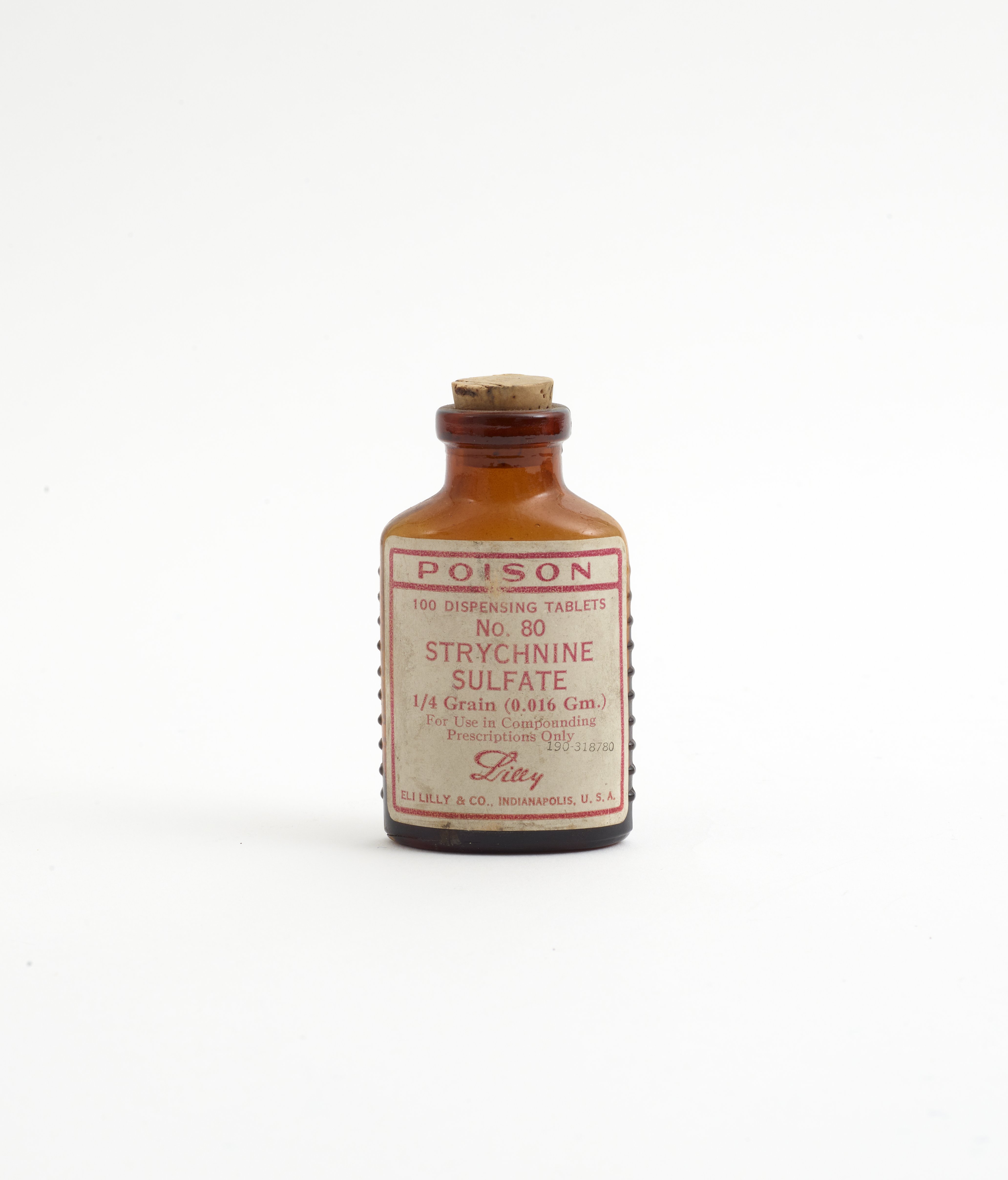 Bottle of Strychnine Sulfate tablets in a brown glass bottle with cork top closure.