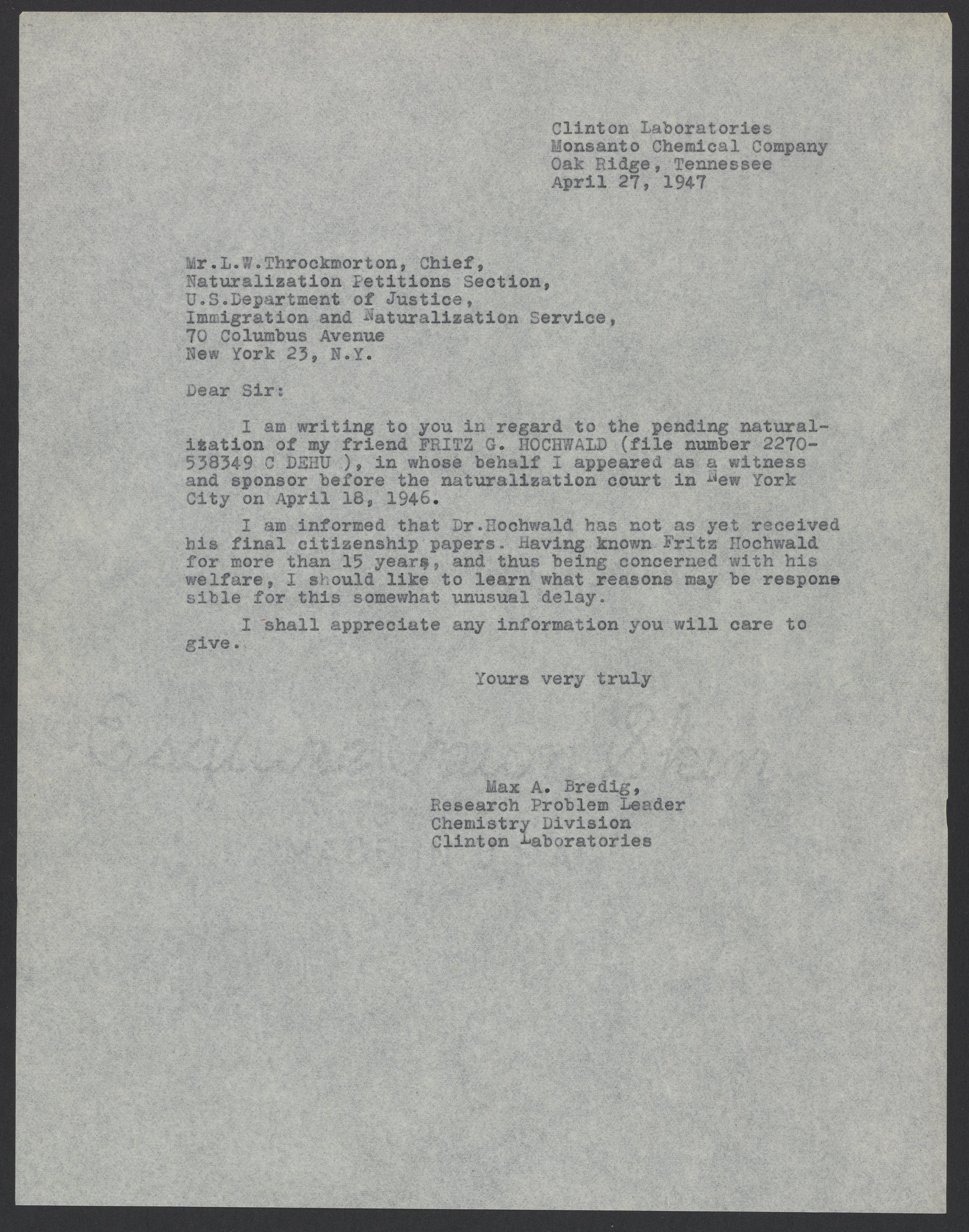 Letter from Max Bredig to L. W. Throckmorton, April 27, 1947