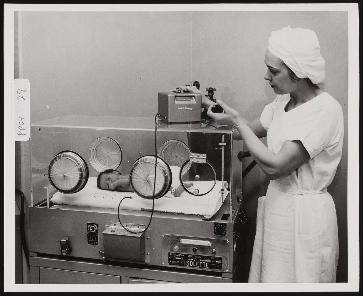 Kassler Studios. “Nurse Using a Beckman Model D Oxygen Meter with an Infant Isolette,” circa 1959. Beckman Historical Collection, Box 80. Science History Institute. Philadelphia. https://digital.sciencehistory.org/works/4x51hj08r.