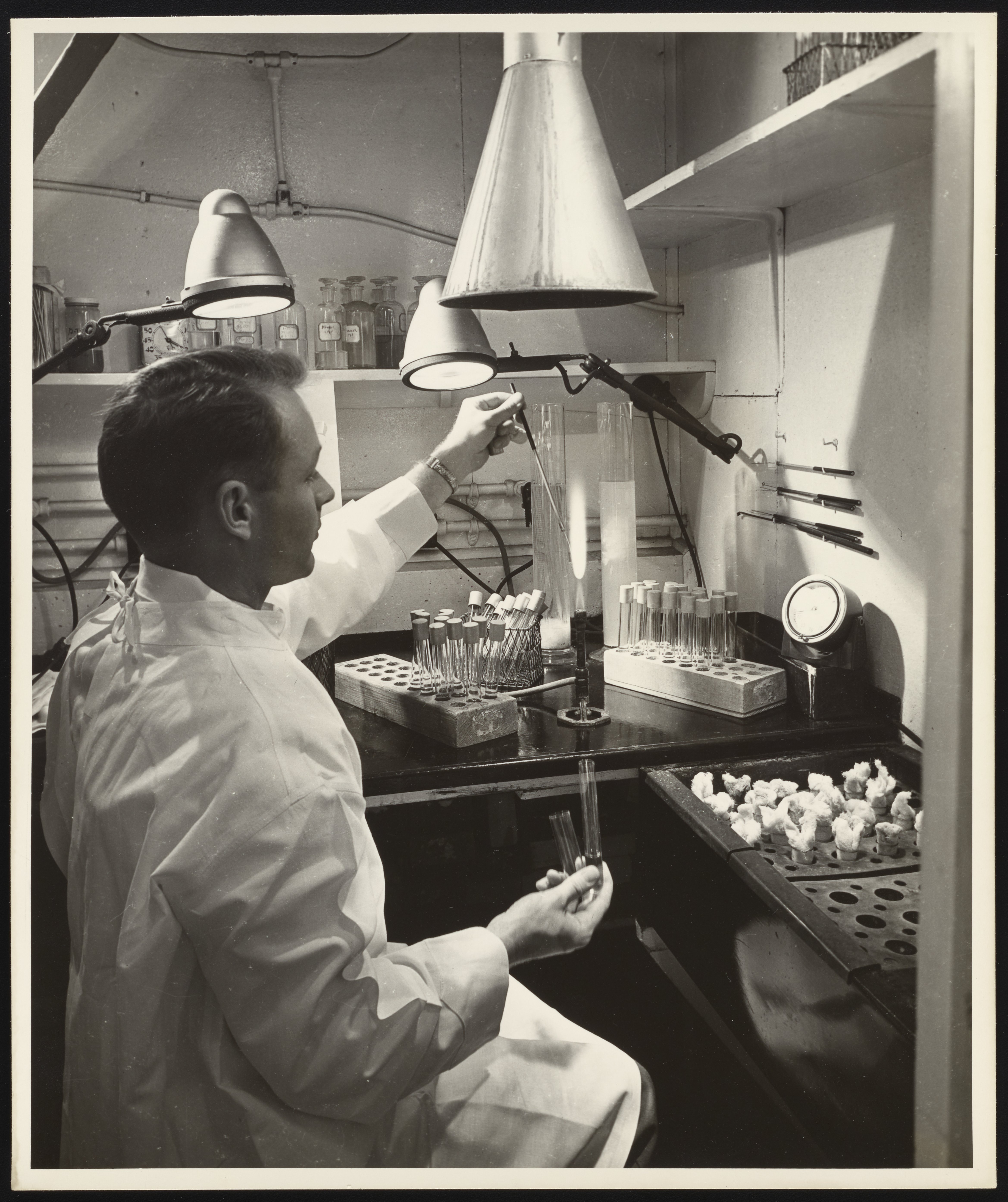 General view of an unidentified employee working with assorted test tubes in the Dow Chemical Company's Biological Chemical Laboratory. The laboratory commonly conducted research and testing related to the development of a range of biologically active products for use in the pharmaceutical, biological, animal healthcare, and agricultural industries.