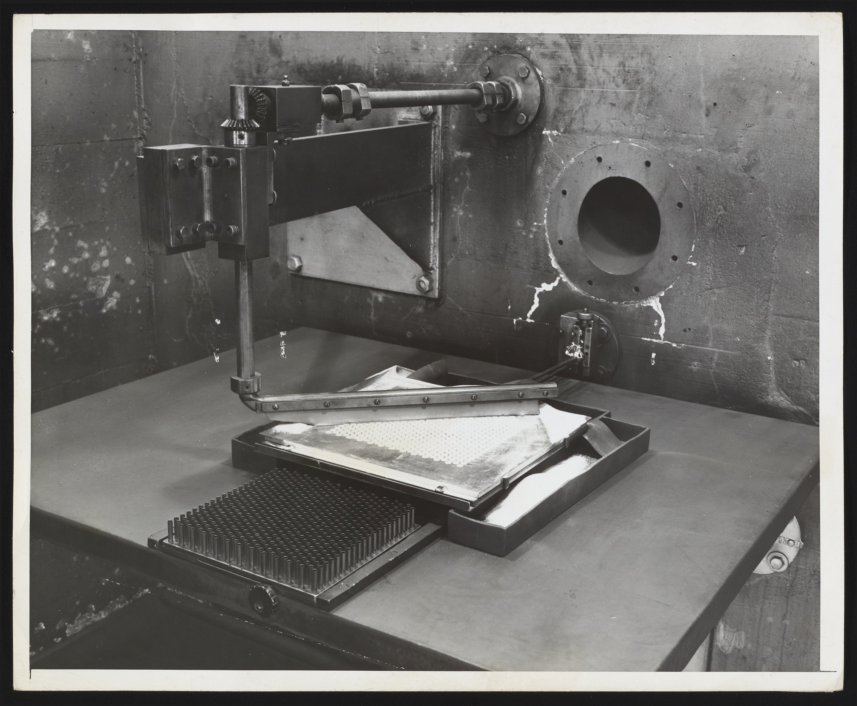 Close-up view of the Charge and Press machine used to fill shells with an explosives charge the Hercules Powder Company plant in Port Ewen, New York. After the charge was pressed into the bottom of the shells, the shells were sent to the Filling Room, where wired plugs were inserted before the shells were packed for shipment.