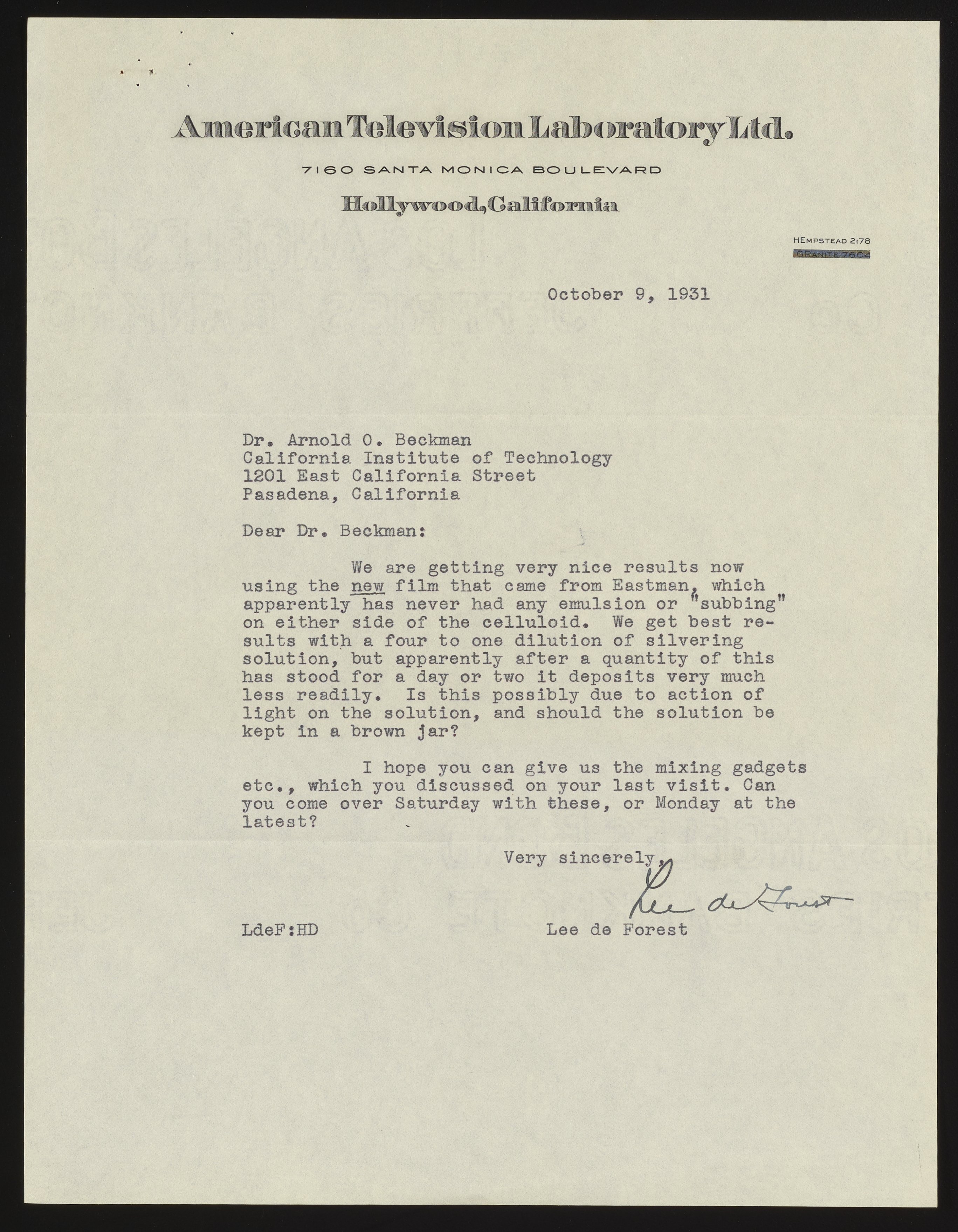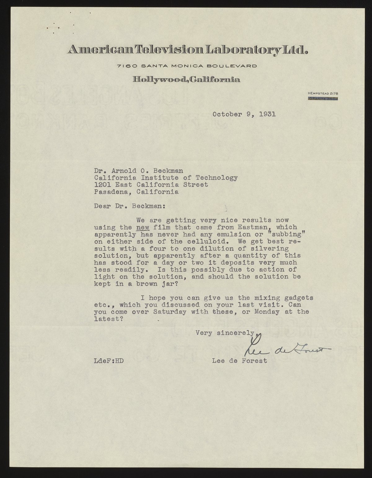 Forest, Lee De. “Letter from Lee De Forest to Arnold O. Beckman,” October 9, 1931. Beckman Historical Collection, Box 1, Folder 17. Science History Institute. Philadelphia. https://digital.sciencehistory.org/works/4x51hj839.