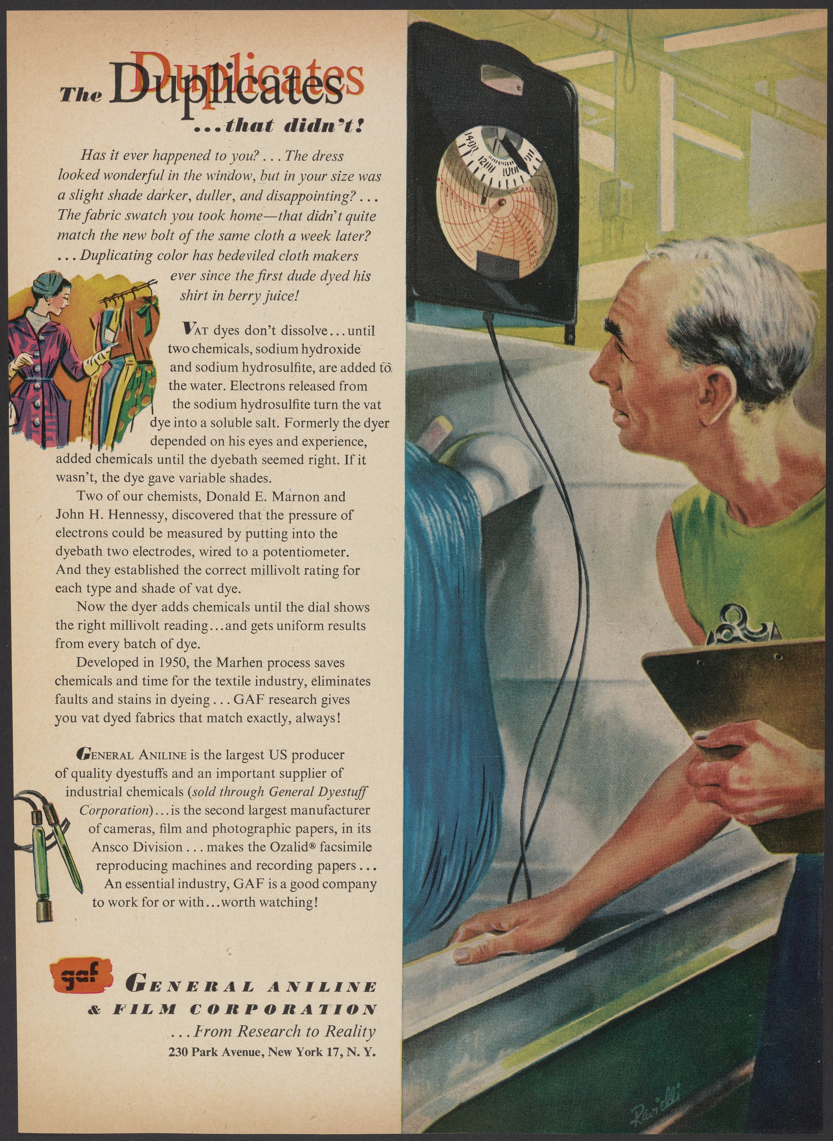 Color print advertisement for the General Aniline & Film Corporation and its standardization of colored dye batches for clothes and textiles. An illustration depicts a man analyzing a potentiometer above a dye vat for a blue textile.