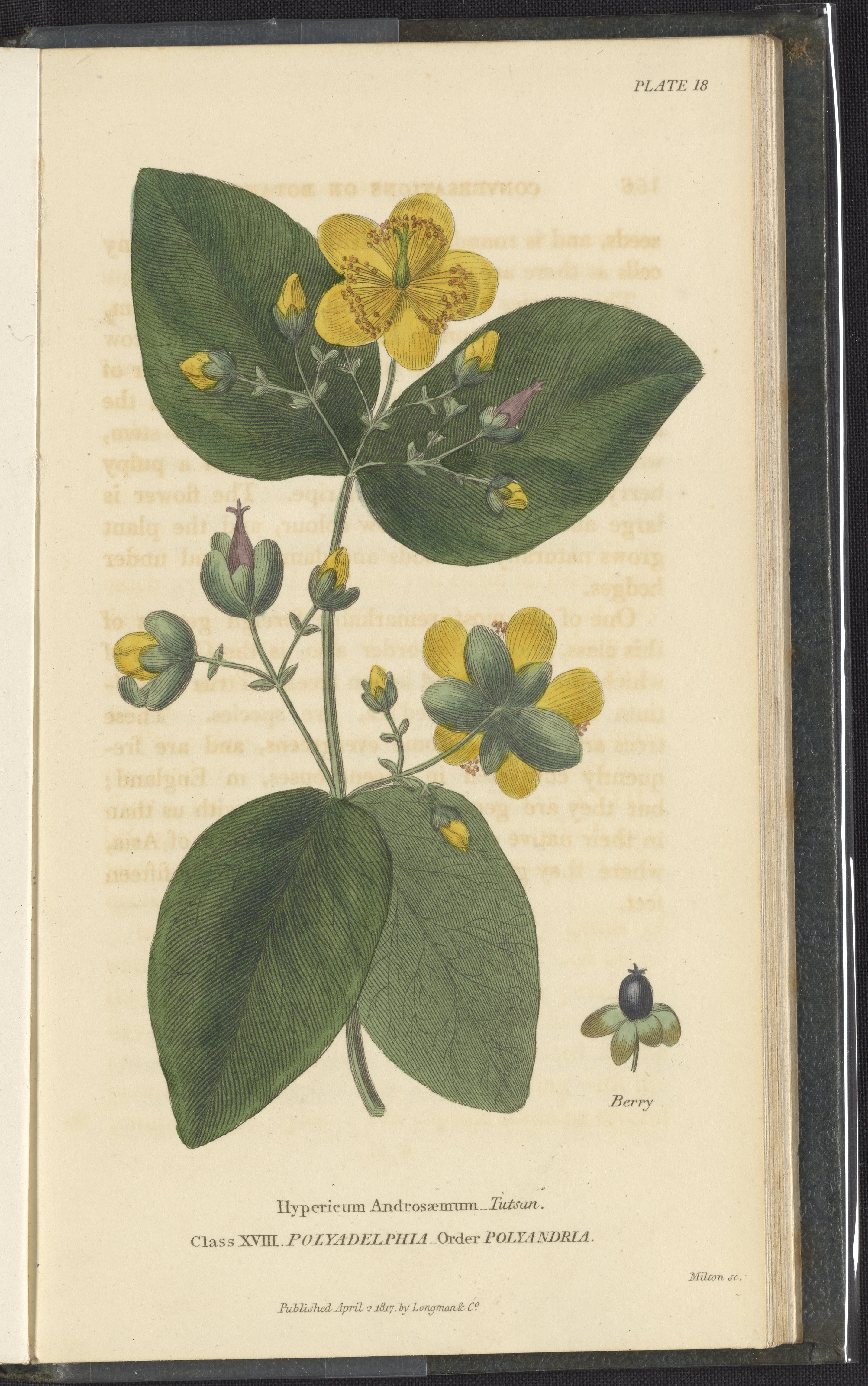 Fitton, Sarah Mary, and Elizabeth Fitton. “Plate 18: Hypericum Androsaemum.” In Conversations on Botany. London, England: Longman, Hurst, Rees, Orme, and Brown, 1817. https://digital.sciencehistory.org/works/5138jd899.