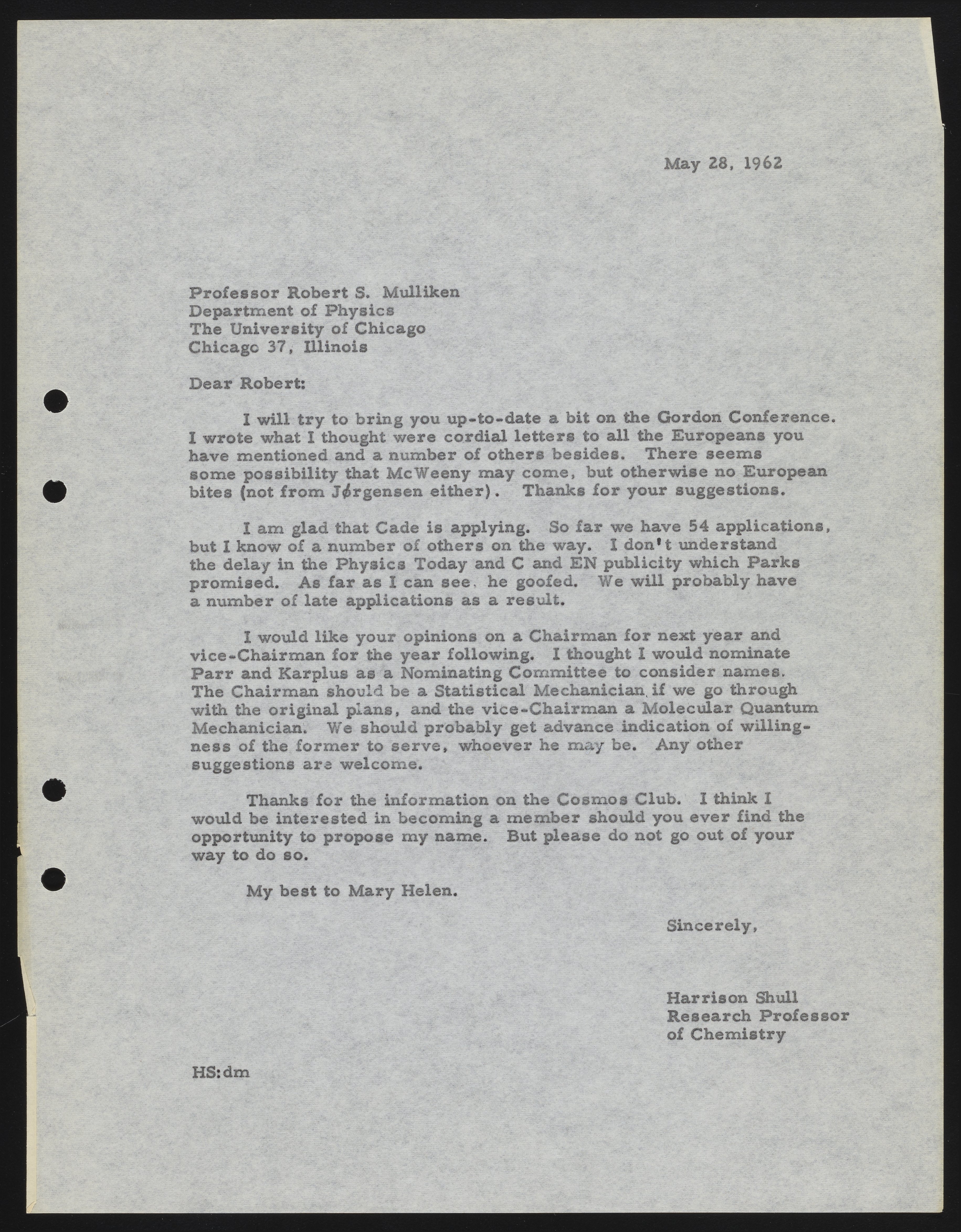 Letter between Harrison Shull and Robert S. Mulliken, American quantum chemists, concerning updates on matters related to a Gordon Research Conference.