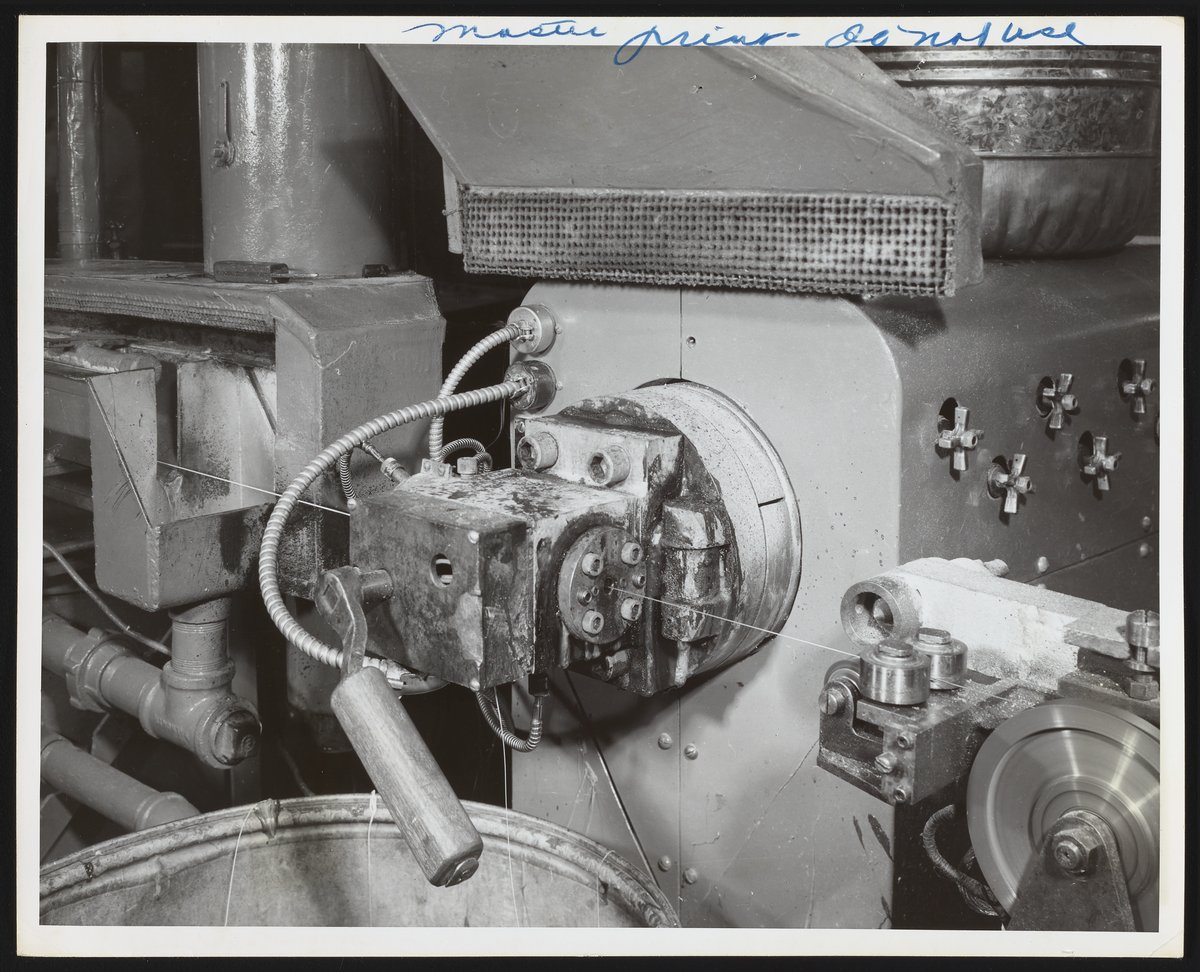 Hercules Incorporated. “Plastic Extrusion Machine at Hercules Port Ewen Plant,” 1954. Photographs from the Records & Ephemera of Hercules Incorporated, Box 2, Folder 37. Science History Institute. Philadelphia. https://digital.sciencehistory.org/works/5138jf45f.