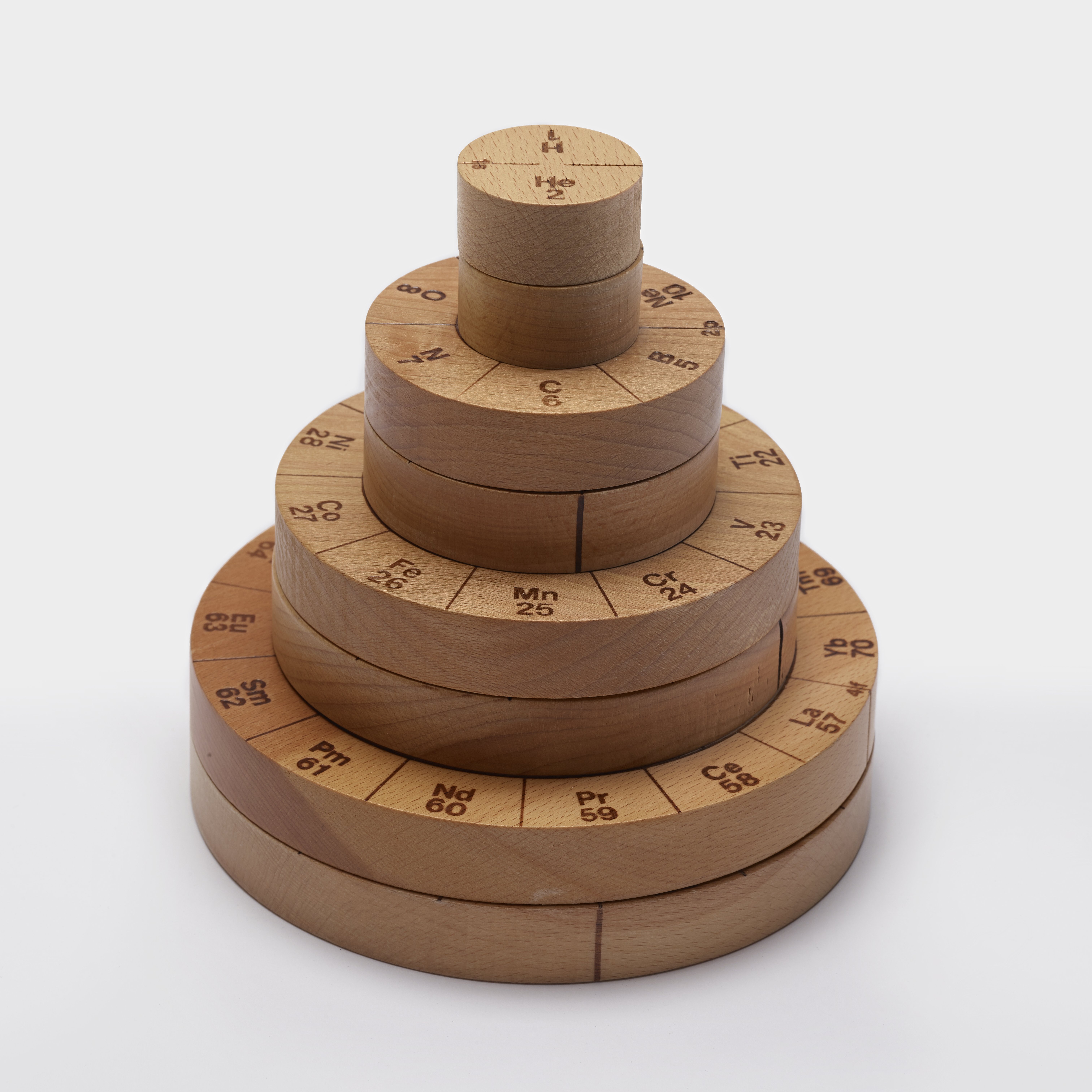 Small JPG1200 x 894px — 118 KBLarge JPG2880 x 2145px — 471 KBFull-sized JPG9000 x 6703px — 3.9 MBOriginal fileTIFF — 9000 x 6703px — 173 MBThe "Periodic Round Table" looks like a multi-layered cake. There are eight wooden layers that sit on top of one another and can be rotated. Layers are divided into chemical elements with engraved element name and number.