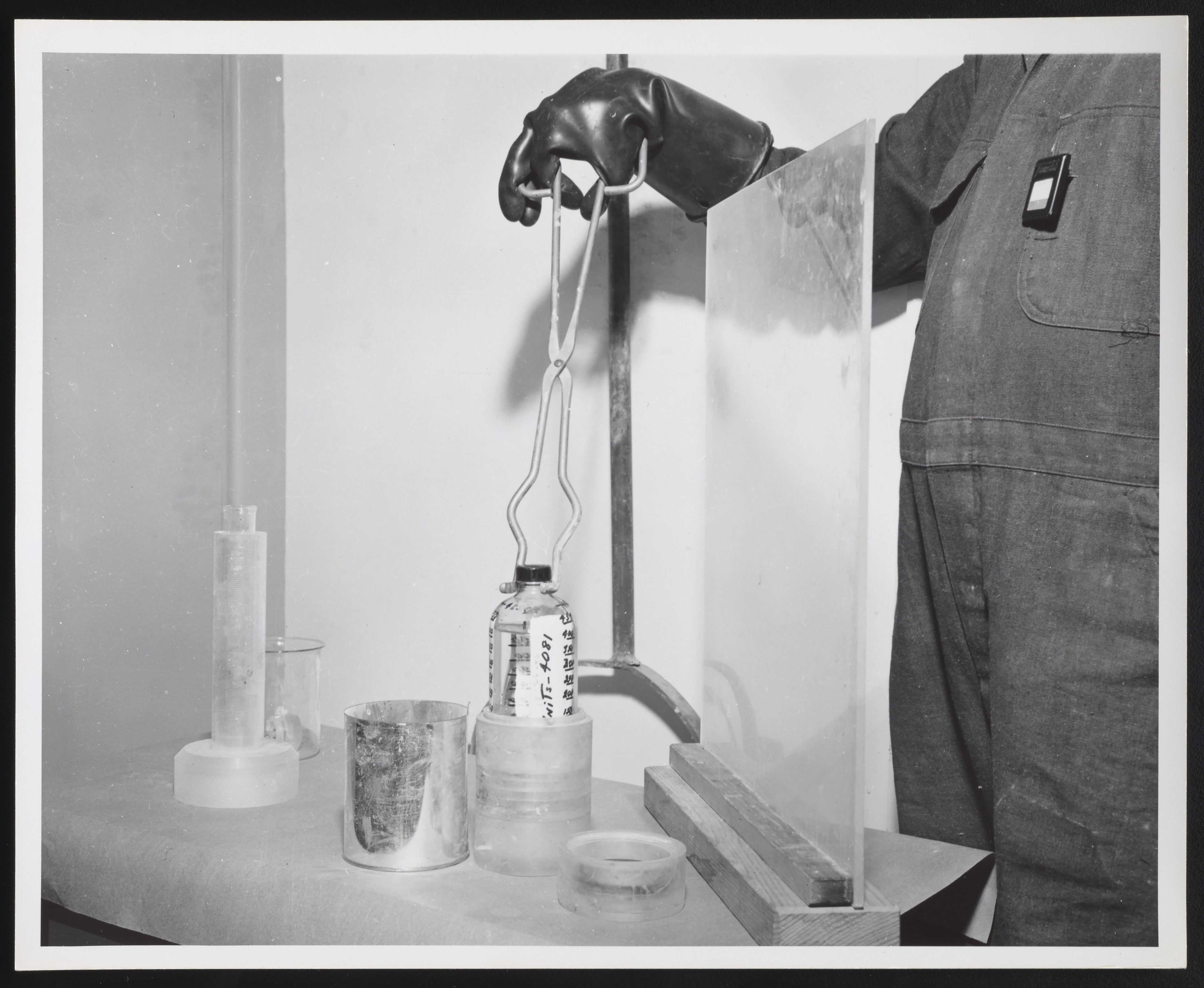 Close-up view of the handling of radioactive material at an U.S. Department of Agriculture facility. The U.S.D.A. commonly used radioactive material for a variety of research and testing, including the study of radioactive substances as fertilizer, as well as to model the impacts of radioactive material in soil and test the effectiveness of new insect control techniques or materials.