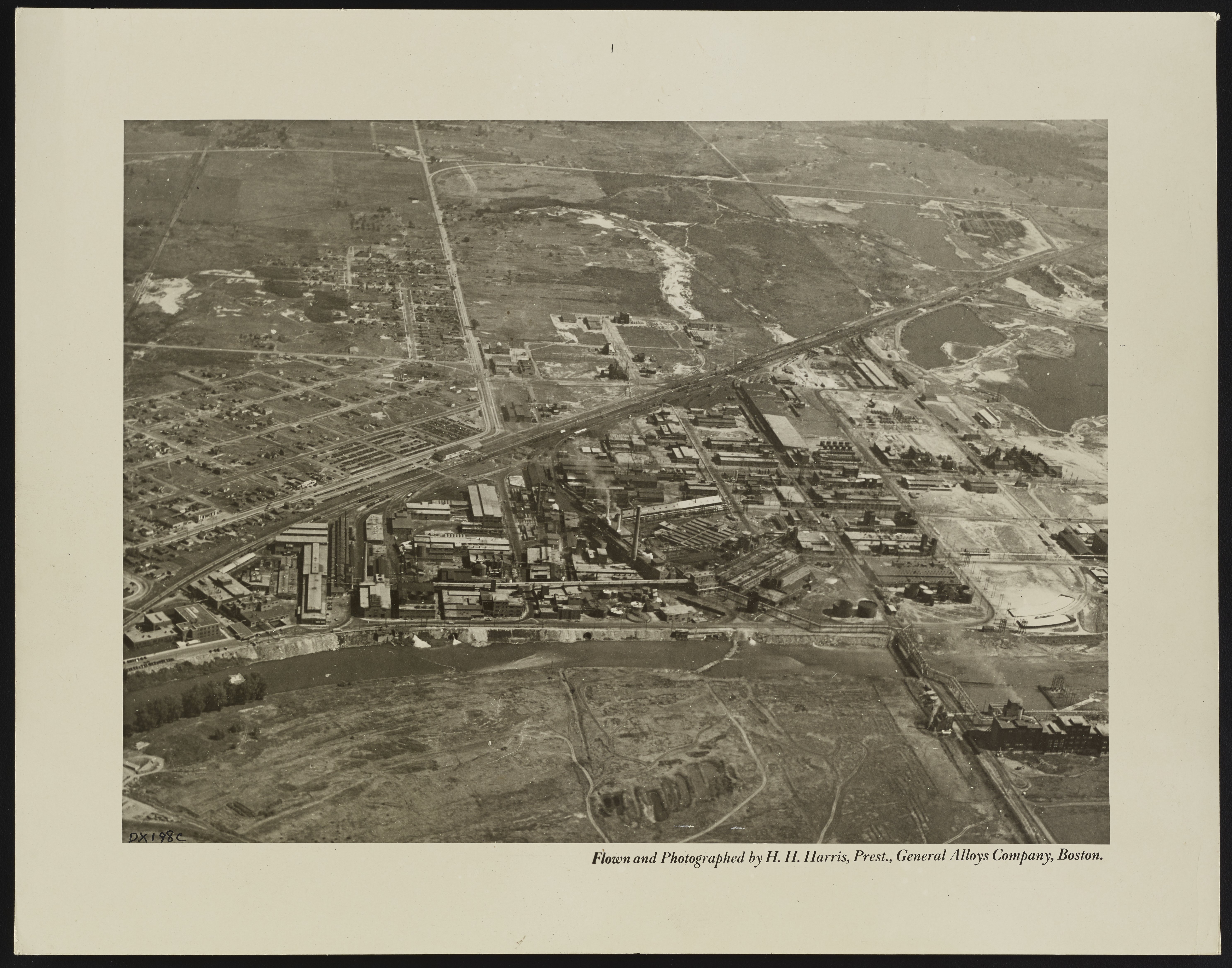 Aerial view of the Dow Chemical Company plants and facilities located in Midland, Michigan. This photograph was taken by H. H. Harris, President of the General Alloys Company of Boston and amateur photographer who frequently took aerial photographs while travelling on business.