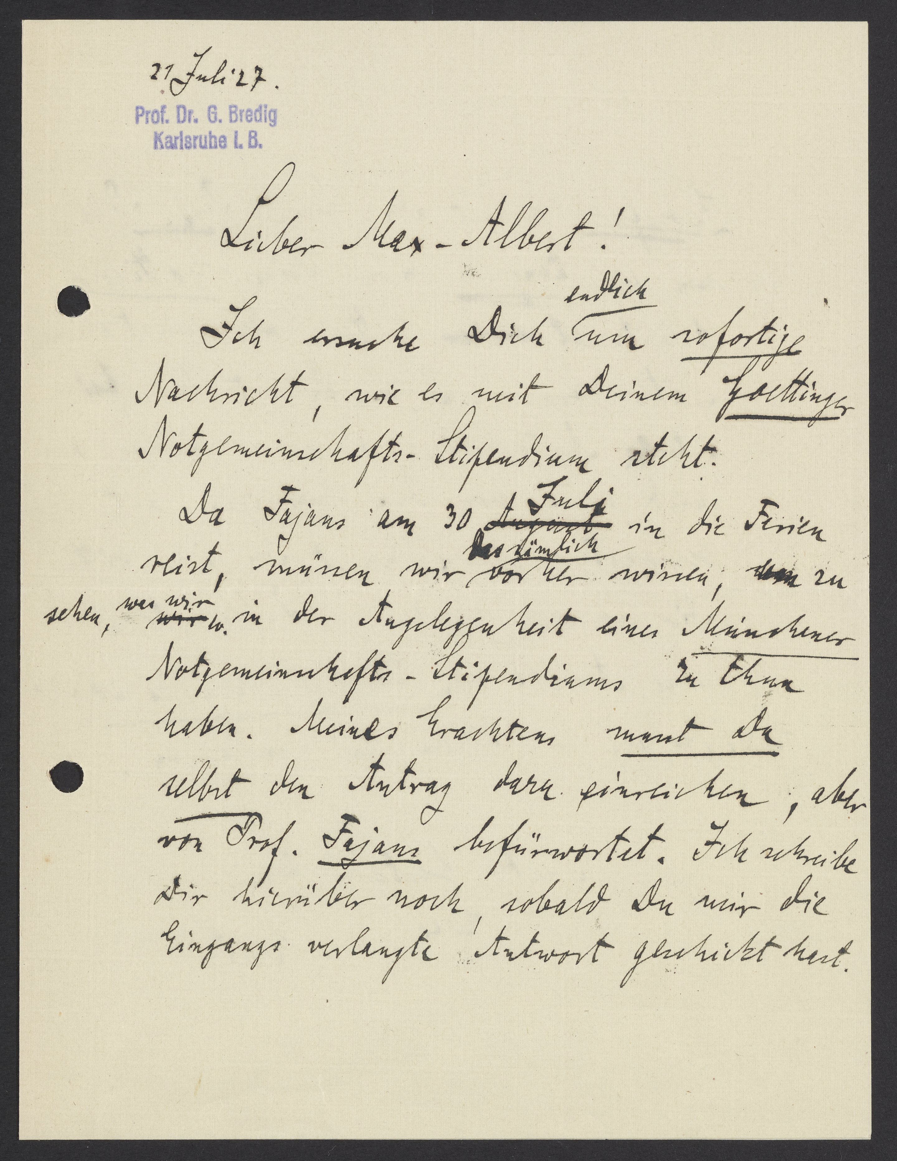 Letter from Georg Bredig to Max Bredig, July 21, 1927