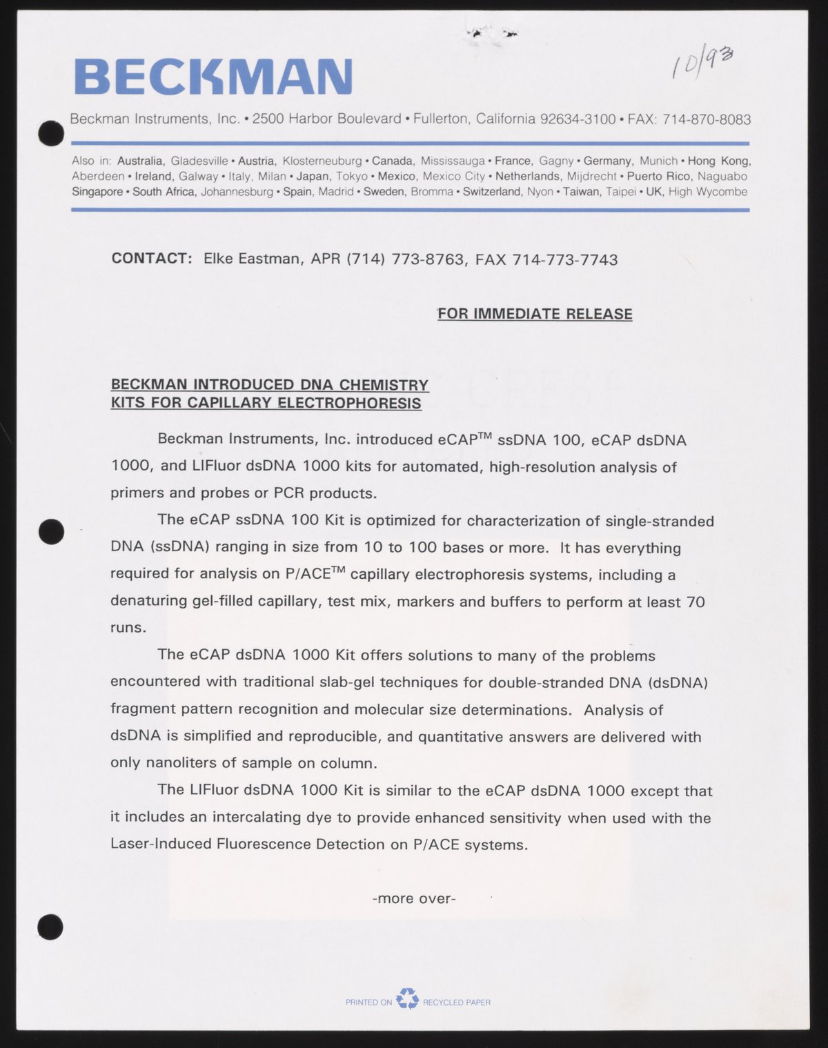Eastman, Elke. “Beckman Introduced DNA Chemistry Kits for Capillary Electrophoresis,” October 1993. Beckman Historical Collection, Box 58, Folder 73. Science History Institute. Philadelphia. https://digital.sciencehistory.org/works/5712m6991.