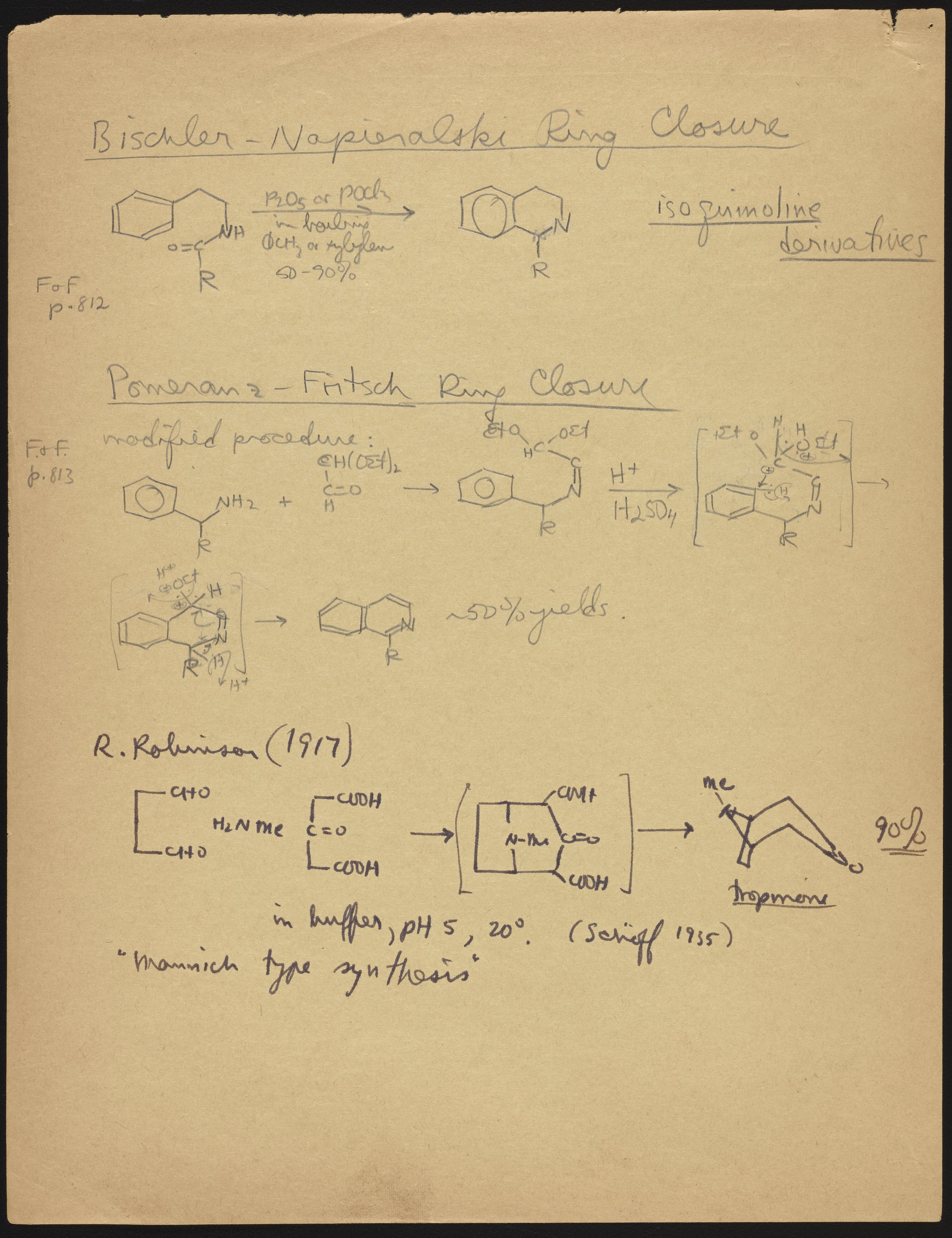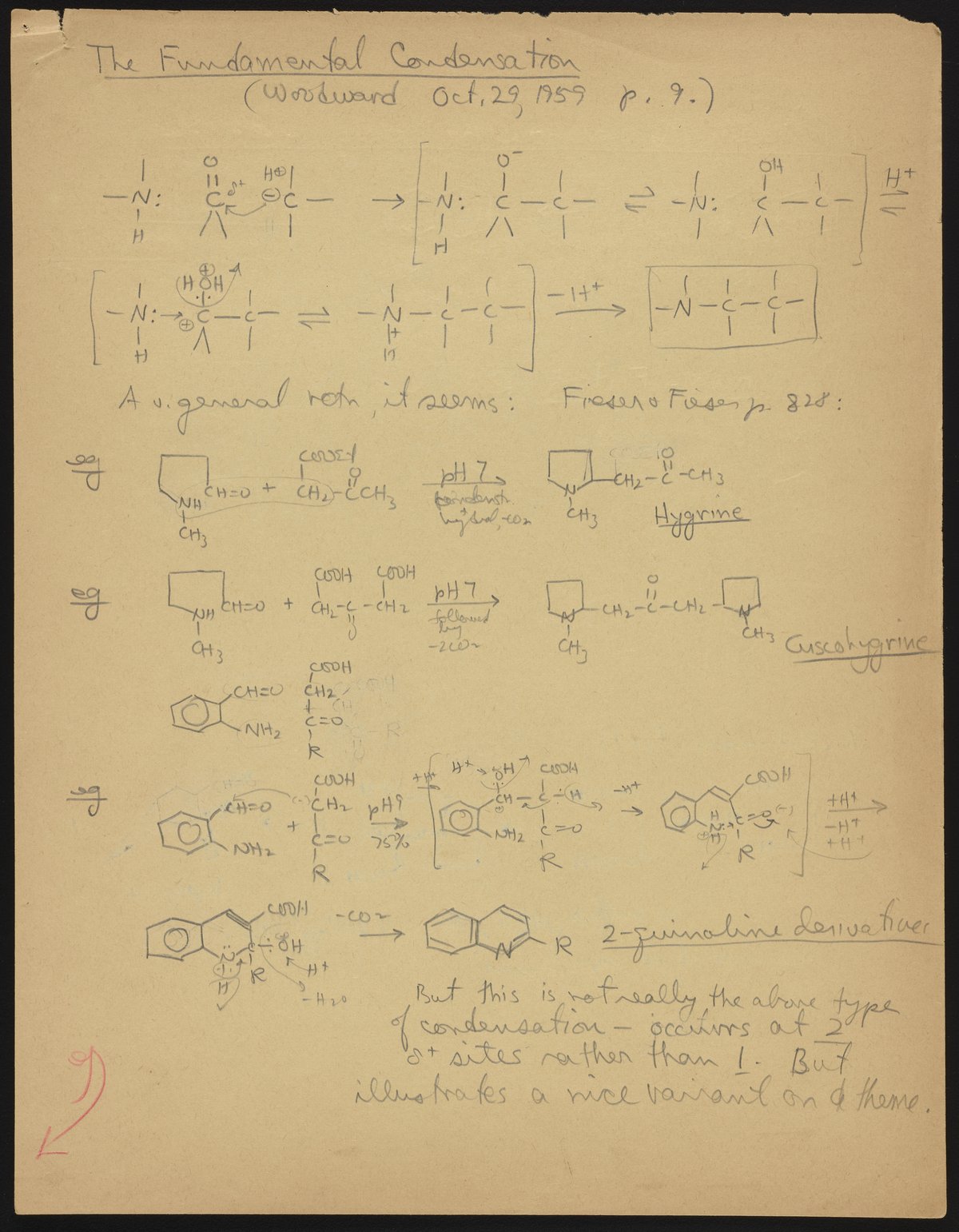 Kohler, Robert E. “R. B. (Robert Burns) Woodward Seminar Entitled ‘The Fundamental Condensation.’” Notes from R. B. (Robert Burns) Woodward's Seminars, circa 1959–1966. Folder 2. Science History Institute. Philadelphia. https://digital.sciencehistory.org/works/5712m745x.