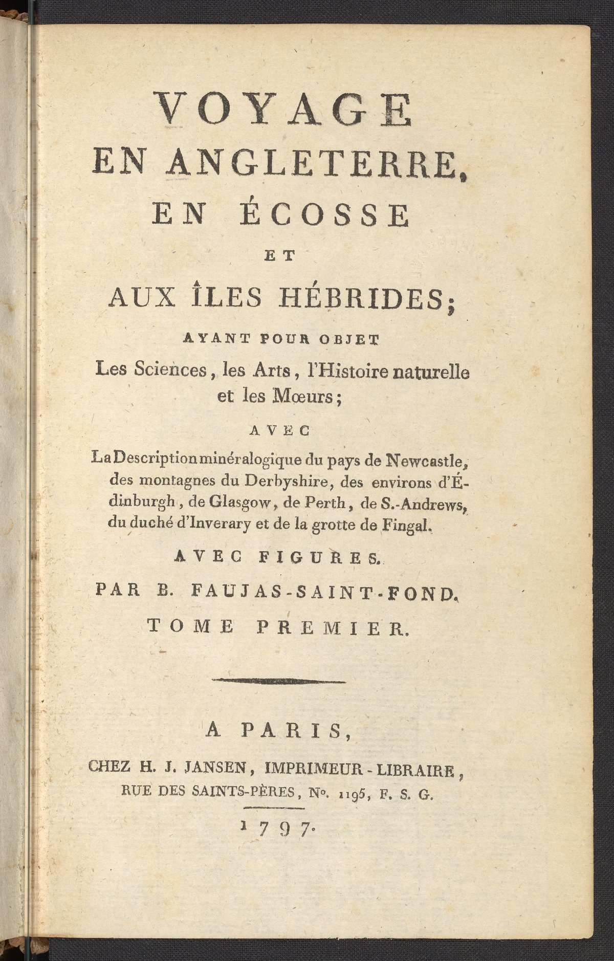 Small JPG1200 x 1878px — 431 KBLarge JPG2880 x 4507px — 2.4 MBFull-sized JPG3108 x 4864px — 2.7 MBOriginal fileTIFF — 3108 x 4864px — 26.2 MBThis book is volume 1 of 2 books written by French geologist Faujas-de-St.-Fond (1741-1819). In 1784 he traveled throughout England, Scotland, and the Hebrides. While the original publication is written in French, de-St.-Fond did speak and understand English. A valuable skill during his travels, as he did not need the aid of a translator, which led to easy conversations with locals. Early naturalists considered these conversations vital to their research, as the local people were considered part of the environment. Locals lived in a sort of symbiosis with their environment, with their culture affecting the environment and their environment affecting their culture. These volumes contain important information on the application of sciences to English industries, as well as the geology of the British Isles. The most notable of the descriptions on the British Isles is that of the geology of the Western Isles of Scotland, which include a plate of Fingal's Cave at the Isle of Staffa.