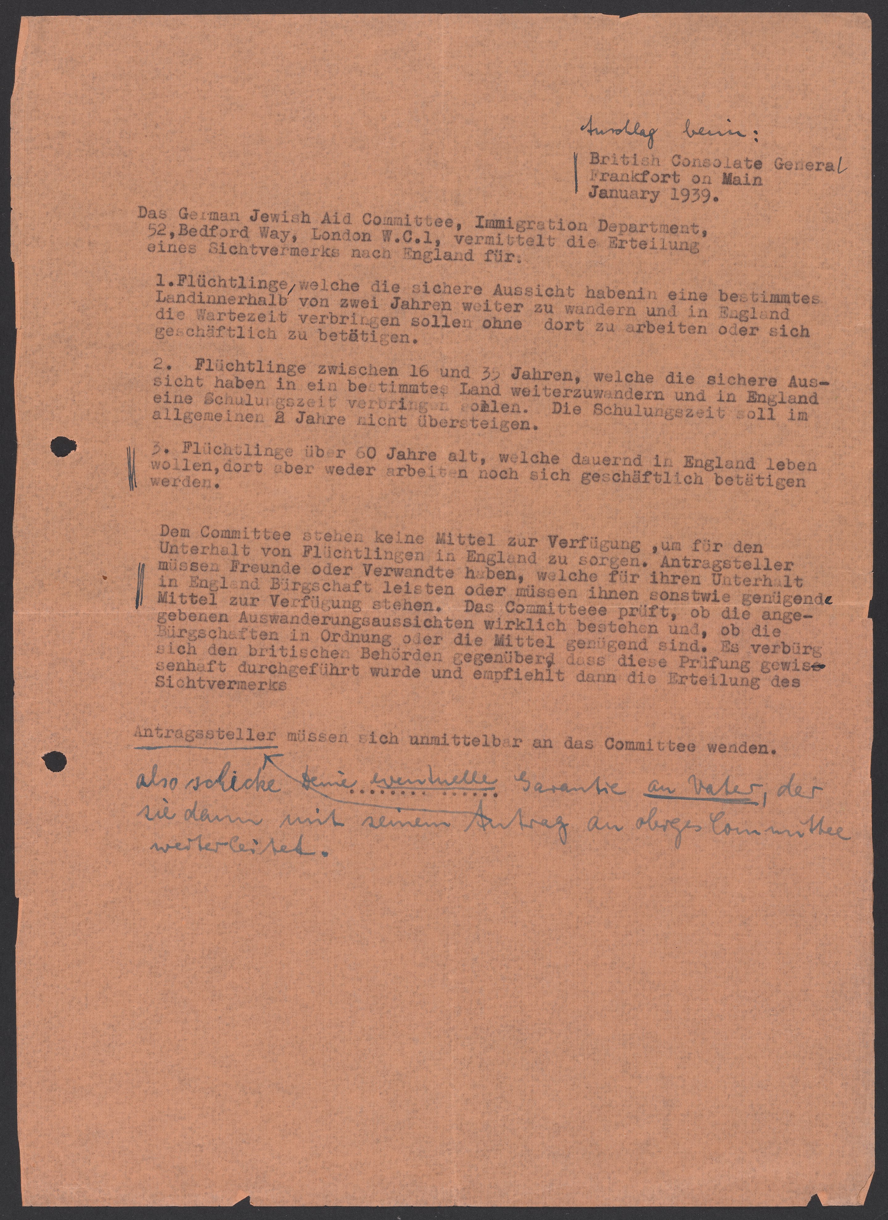 The British Consulate in Frankfurt, Germany provides information on the various categories of immigration visas mediated by The German Jewish Aid Committee in London. A note from Max Bredig (1902-1977) to his sister, Marianne Homburger (1903-1987), is included.