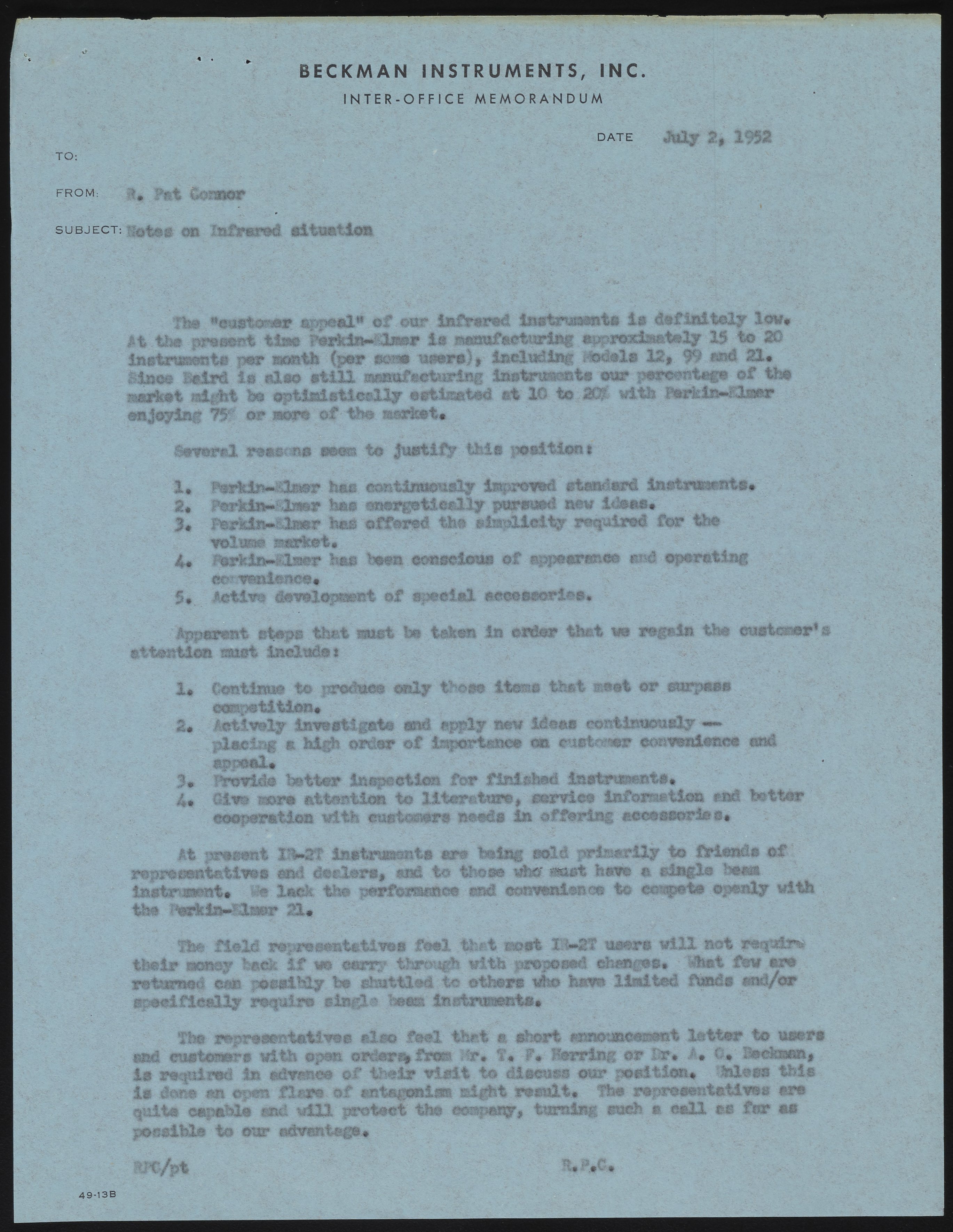Memo from R. Pat Connor to Beckman Instruments staff