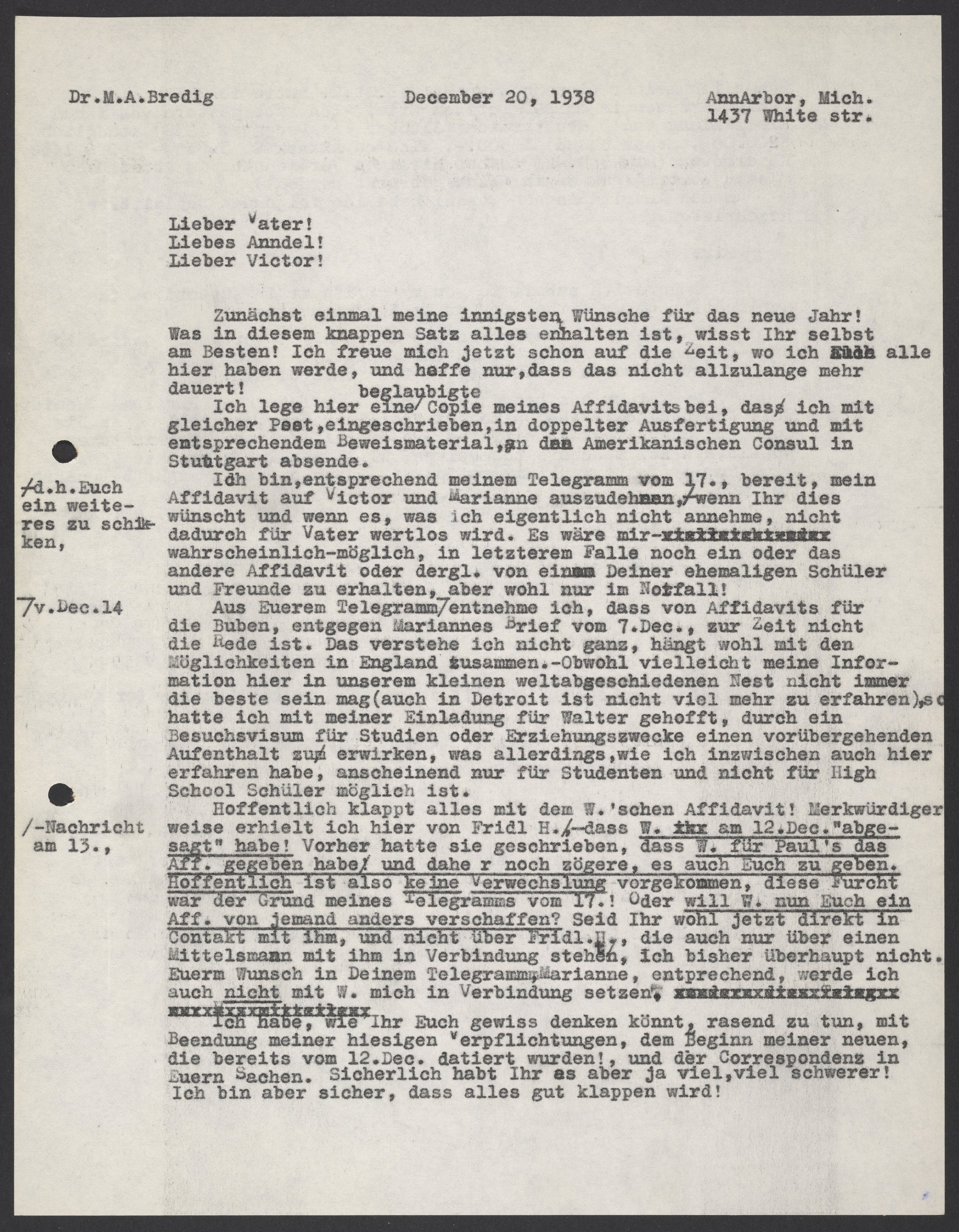 From your telegram on December 14th, I gather that, contrary to Marianne's letter from December 7th, there is currently no discussion of affidavits for the boys. I don’t quite understand that, but it probably has something to do with the possibilities in England. Although my information may not always be accurate here in our little isolated town (there is not much more to learn in Detroit either), I had hoped to help Walter obtain a temporary residence permit through a visitor’s visa for study or educational purposes. However, I have learned in the meantime that this is apparently only possible for university students and not high school students.