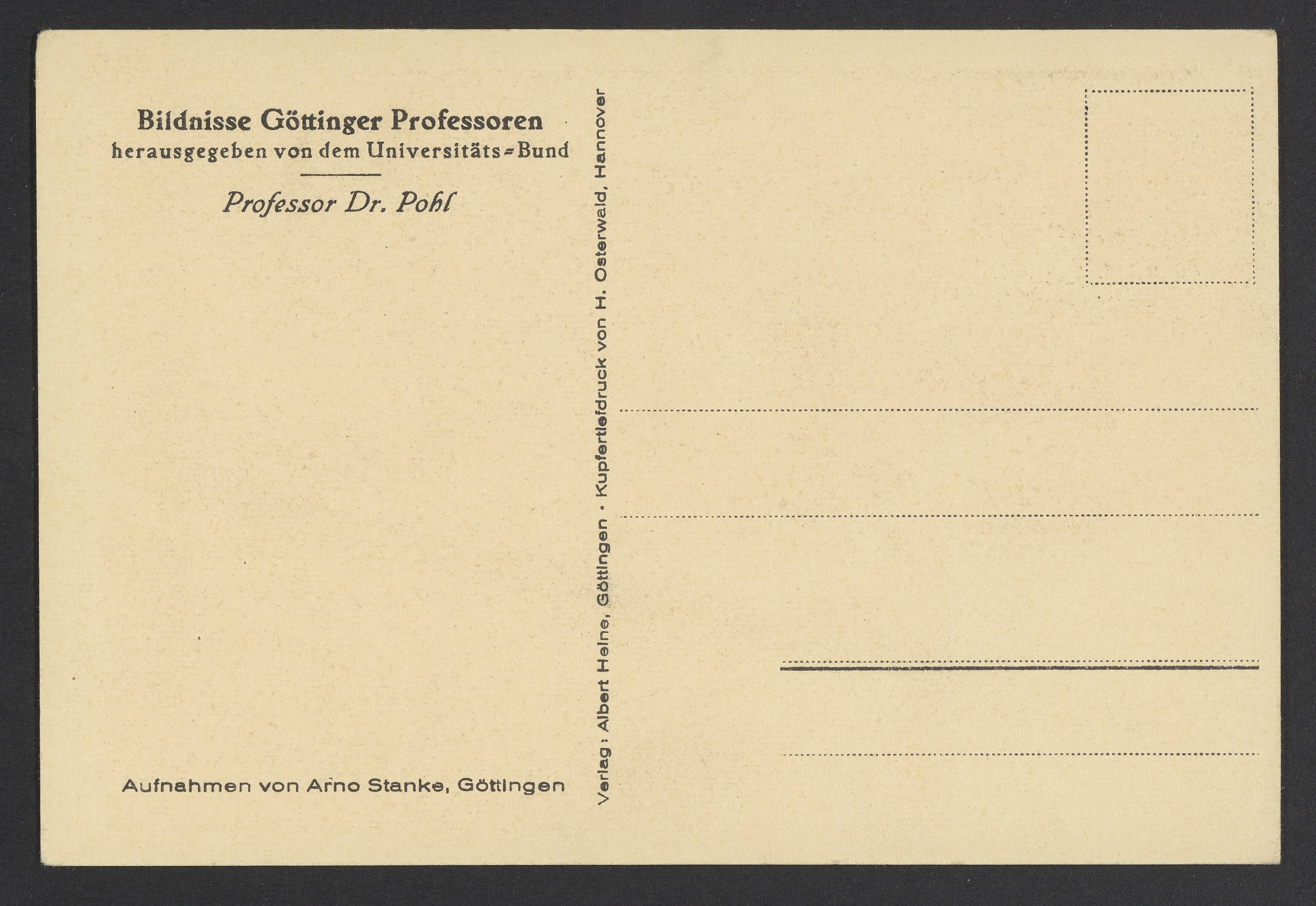 Small JPG1200 x 1725px — 469 KBFull-sized JPG2447 x 3518px — 1.9 MBOriginal fileTIFF — 2447 x 3518px — 24.7 MBPostcard featuring a black and white portrait of Robert Wichard Pohl ( 1884-1976). Pohl was a German physicist and professor at the University of Göttingen. He is known for being a pioneer in the field of solid-state physics.