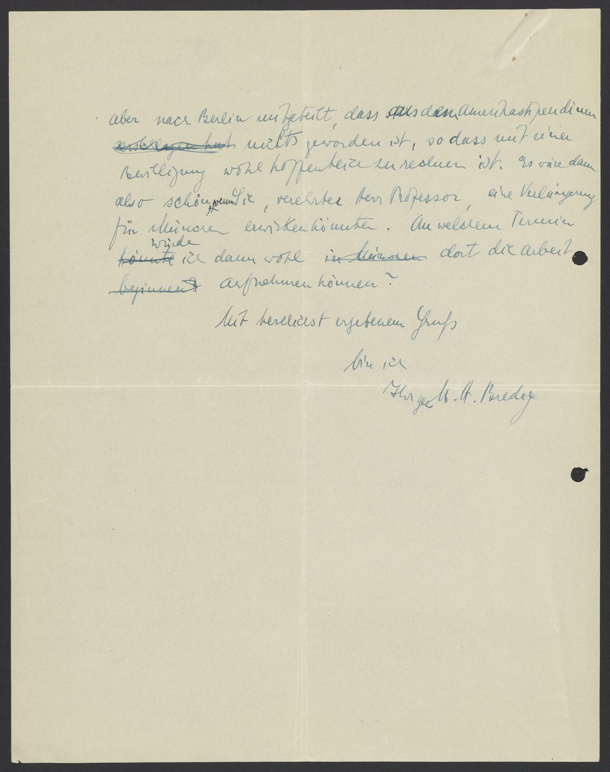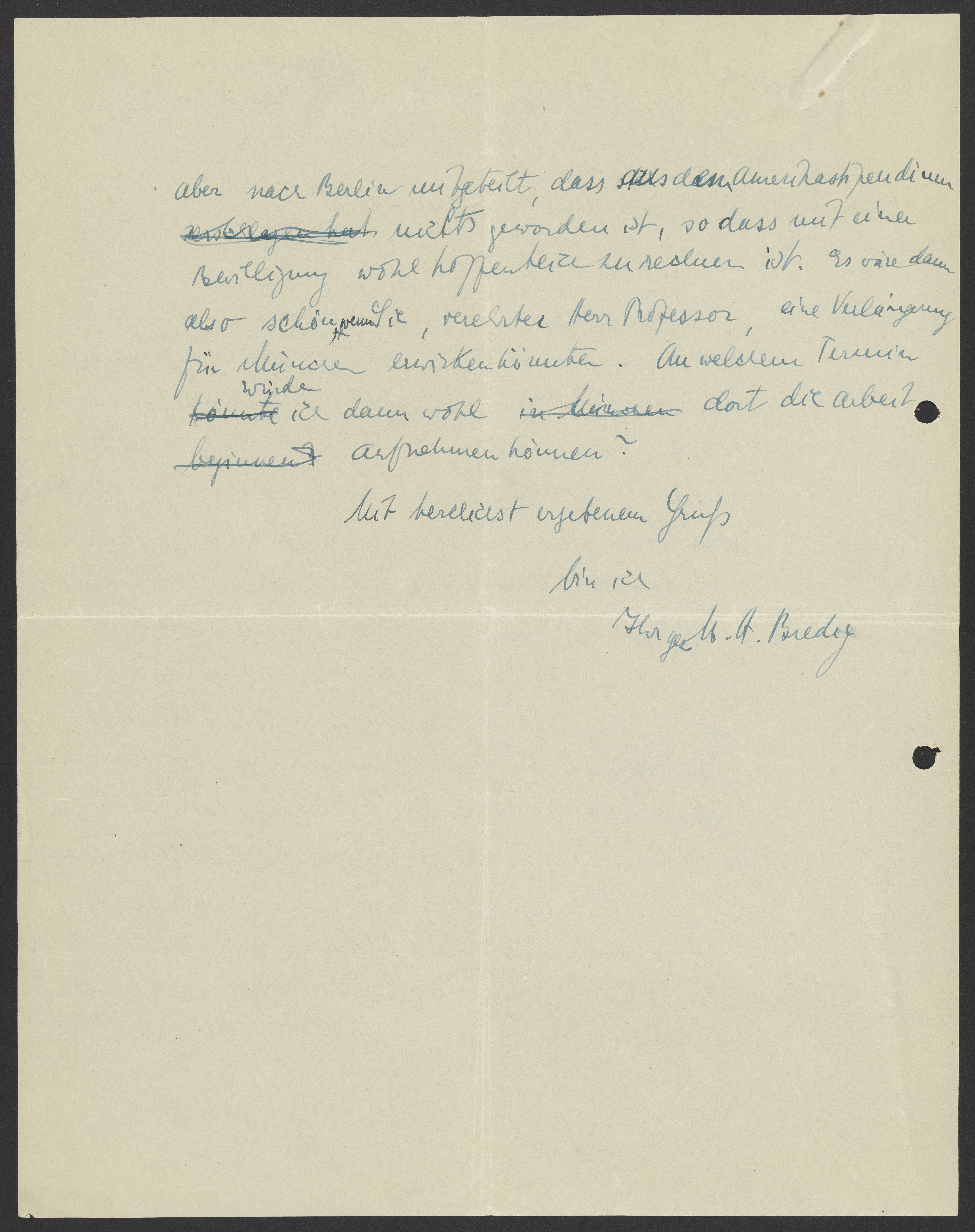 aber nach Berlin mitgeteilt, dass das Austauschstipendium nichts geworden ist, so dass mit einer Bewilligung wohl hoffentlich zureden ist. Es wäre denn also schön, wenn Sie, verehrter Herr Professor, eine Verlängerung für München einwirken könnten. An welchem Termin würde ich dann wohl dort die Arbeit aufnehmen können?