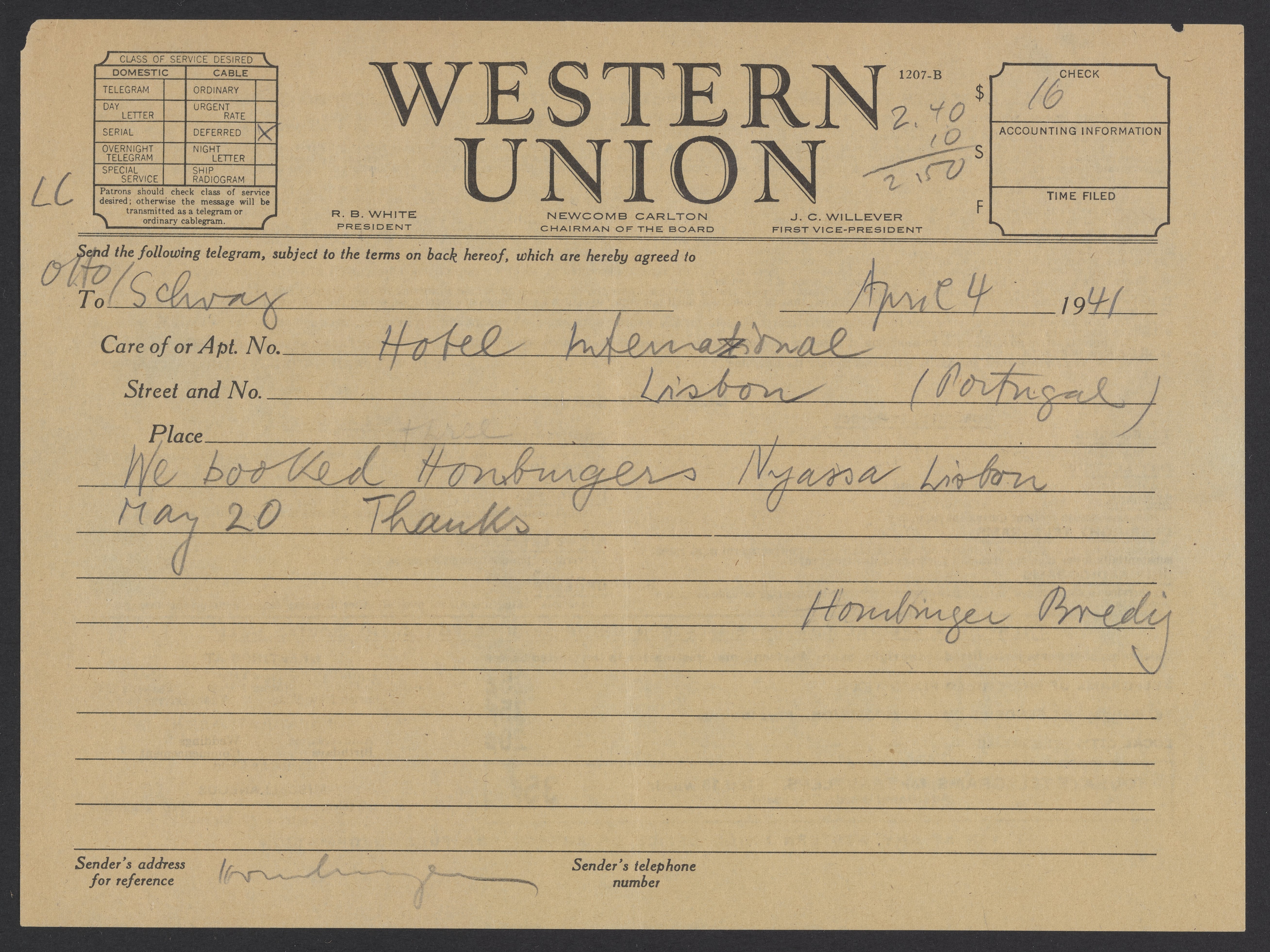 Max Bredig (1902-1977) tells Otto Schray that tickets for Marianne Homburger (1903-1986), Paul Homburger (1882-1965), and Viktor Homburger (1888-1968) have been booked from Lisbon.