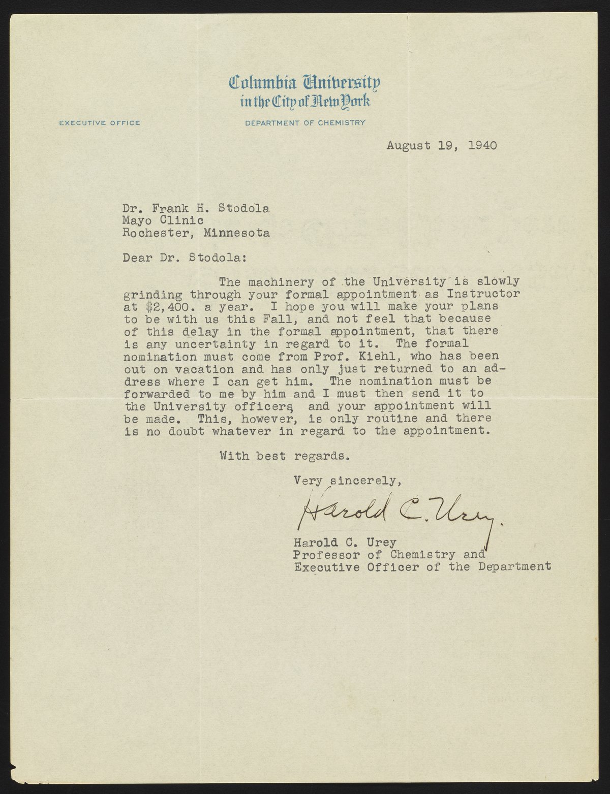 Urey, Harold Clayton. “Letter from Harold Urey to Frank Stodola,” August 19, 1940. Frank H. Stodola Nobel Laureate Letter Collection, Box 1. Science History Institute. Philadelphia. https://digital.sciencehistory.org/works/5d86p023d.