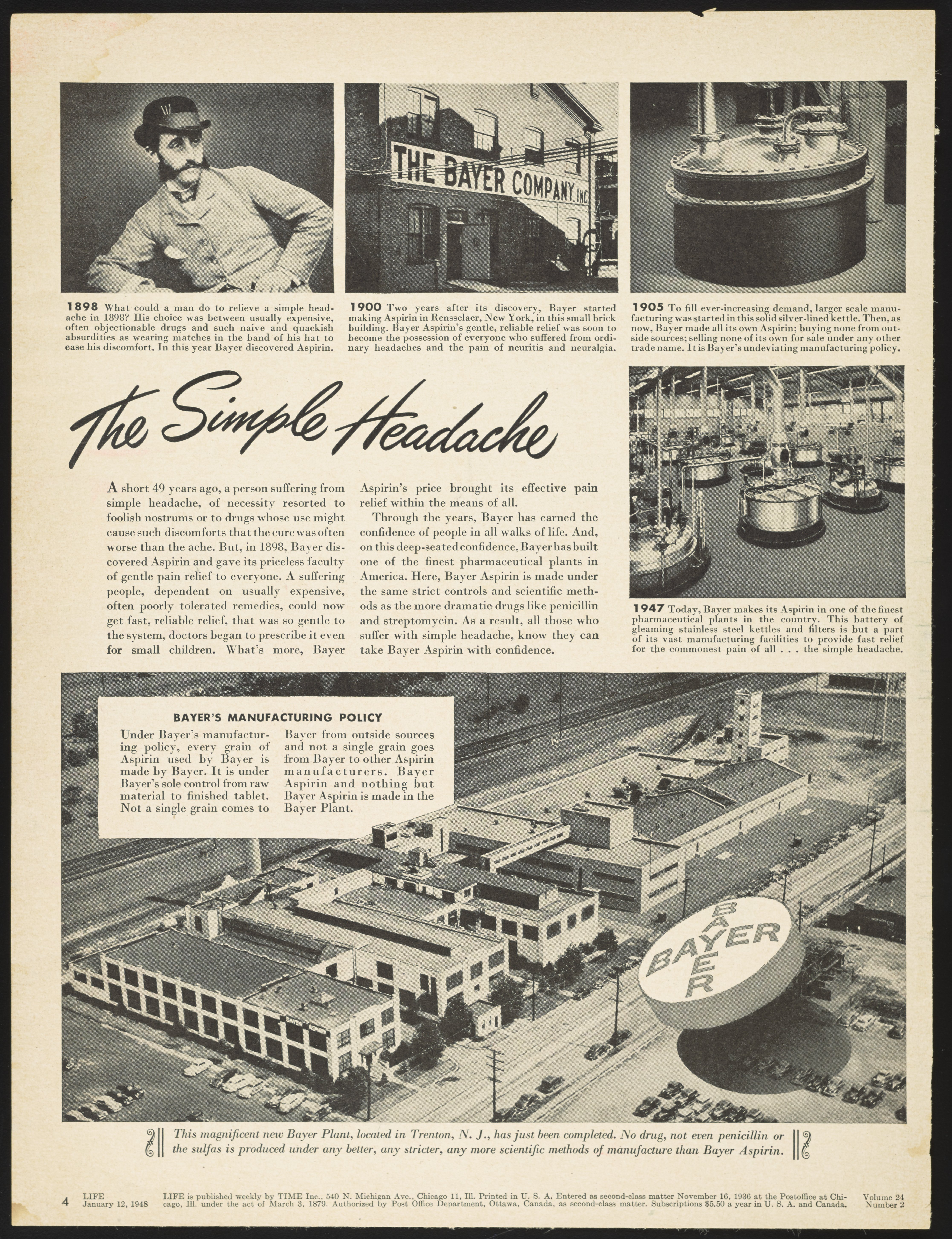 Black and white print magazine advertisement for the Bayer Company featuring an aerial view image of Bayer's plant in Trenton, New Jersey, images of the interior of the manufacturing plant, and a timeline of the development of Bayer Aspirin.